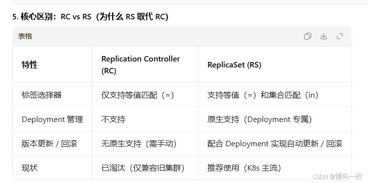首先明确一个关键前提:Replication Controller(RC)是 Kubernetes 早期的 Pod 副本控制器,ReplicaSet(RS)是 RC 的升级版,而