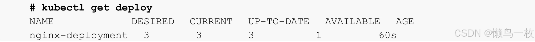 deployment.apps/nginx-deploy 3/3 3 3 10sNAME DESIRED CURRENT READY AGE