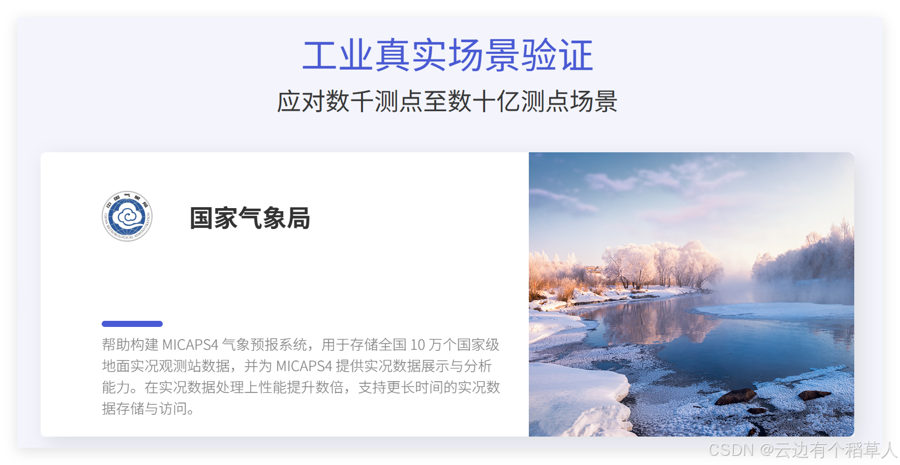 存储全国10万个国家级地面实况观测站的时序数据,实现实况数据处理性能数倍提升,支持更长时间的实况数据存储与访问,为气象预报、气候分析提供稳定、高效的数据管理能力。