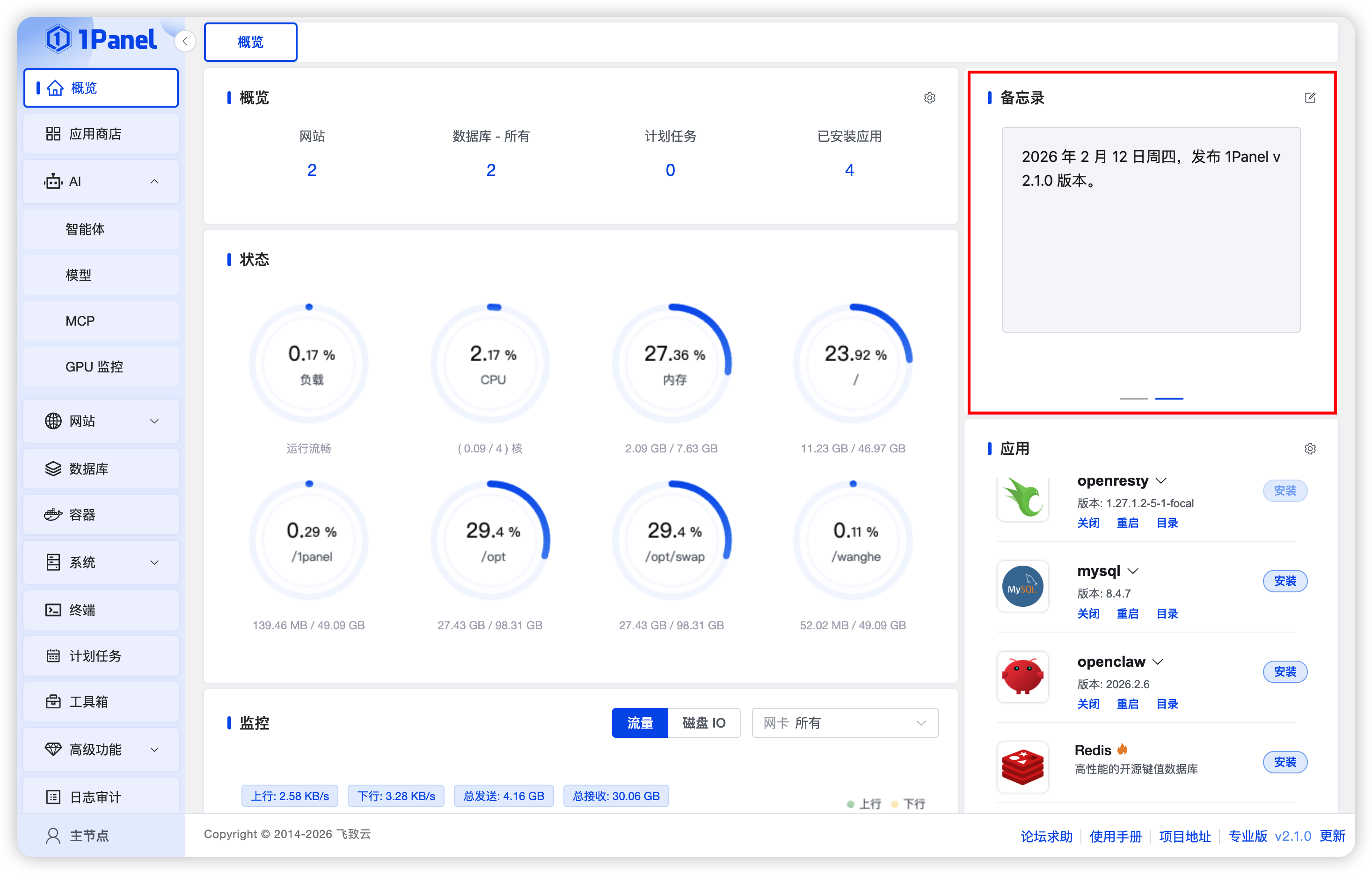 1Panel v2.1.0版本在"概览"页面新增了备忘录功能。用户可以直接在面板内记录重要事项、变更说明与运维备注,减少信息分散带来的沟通成本。通过备忘录,团队成员可以更快速地了解当前环境的关键状态与处理背景,便于后续维护与协作交接。