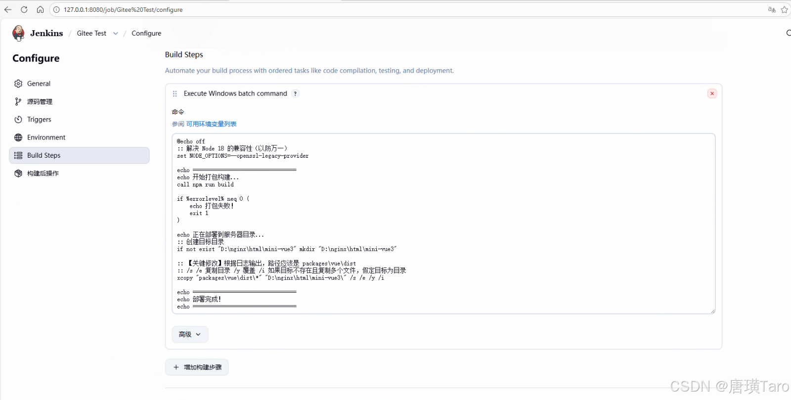 挑战: 内网服务器外网无法访问(无法使用 Webhook),Windows 批处理语法与 Linux 不同,旧版 Vue2 与高版本 Node 的兼容性问题。