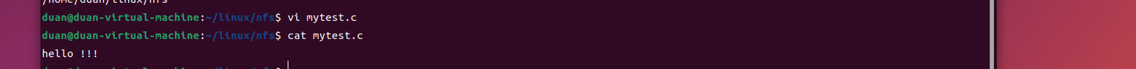 在 /home/duan/linux/nfs 目录下创建一个 mytest.c 文件,在里面写入 hello world! 如下图所示: