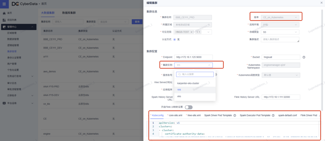 云原生架构引擎融合:用户可通过CyberData页面选择"CE_on_Kubernetes"类型来快速绑定CyberEngine提供的云原生集群,平台提供对Kubeconfig、Core-Site配置的自动快速填充,用户可享有即开即用的极致数据开发体验。