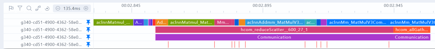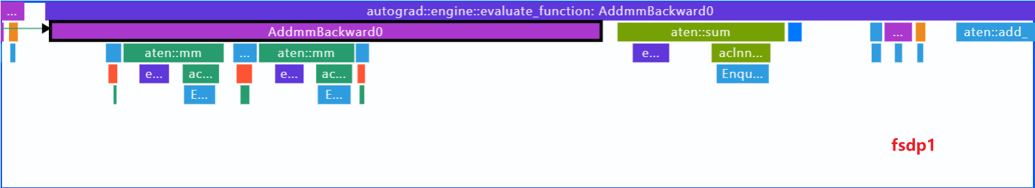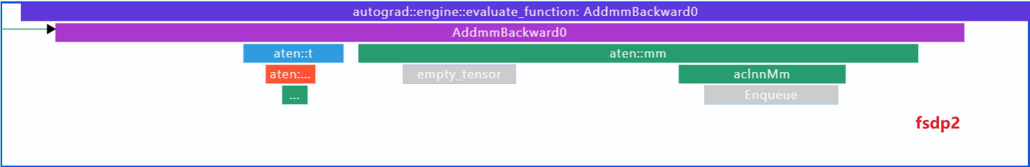 如下图,Profiling中AddmmBackward是linear层的反向,可以看到连续下发了两个matmul算子 (aten: mm),分别用于计算权重的梯度和反向激活值