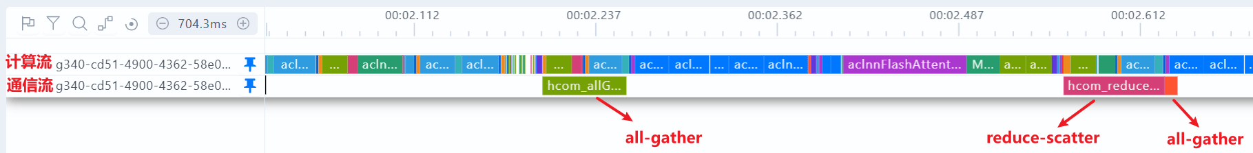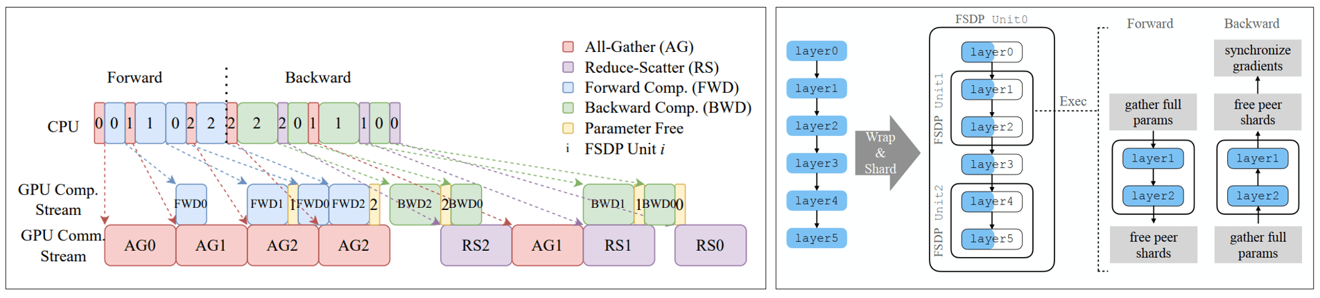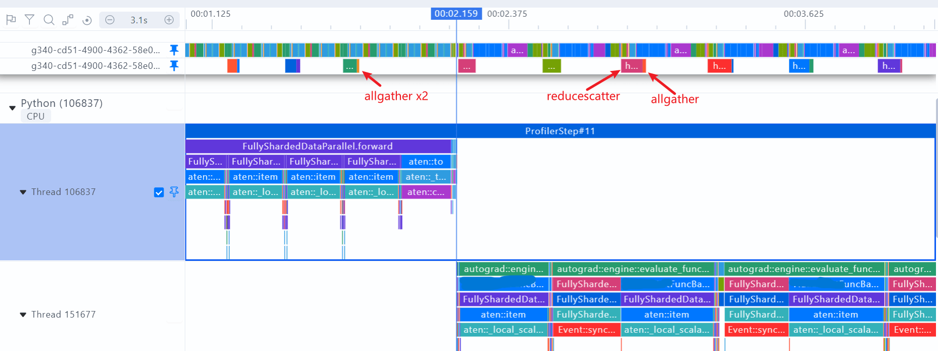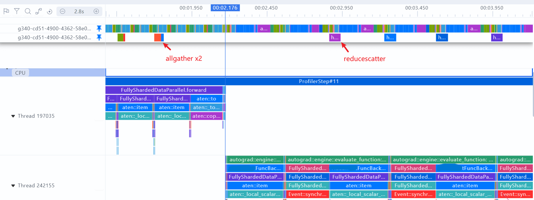 为达到这一效果,FSDP 采用一条独立的 CUDA 流来下发通信算子(包括 all-gather 和 reduce-scatter)