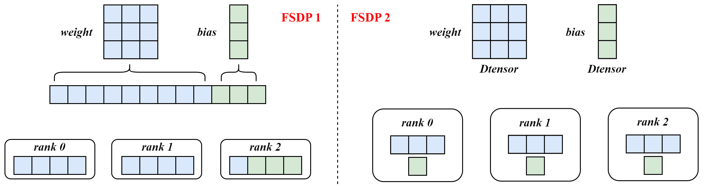 以nn.Linear(3, 3)为例,weight的shape是(3, 3),bias的shape为(3, )。在FSDP1上,weight和bias被展平、拼接、填充为1D张量,用于参数分片和通信;而在FSDP2上,weight和bias都沿着dim=0进行切分,由DTensor进行管理。