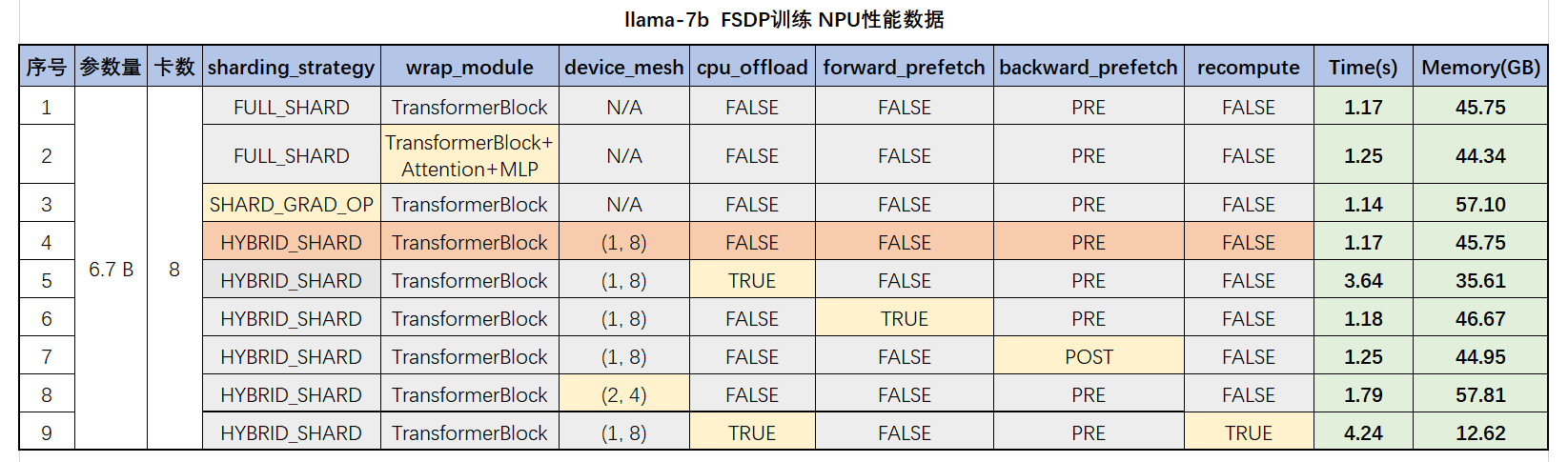 FSDP的配置不同,性能也不同;下面是 llama-7B 在 8 卡 NPU 上的性能测试数据,各参数的含义后面会说明