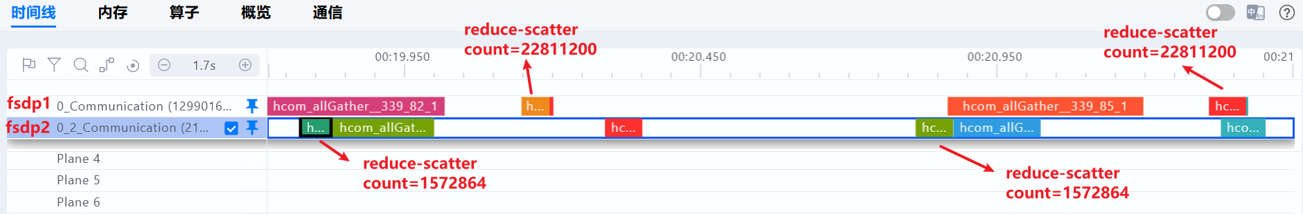 在LORA场景,DiTBlock是一个FSDP单元,包含了冻结(主干网络,backbone)和非冻结(lora层)的参数。在FSDP1中,冻结的参数与非冻结的参数占用相同的显存,一起被展平、分片以及集合通信;在FSDP2中,每个Tensor沿着0维切片,由Dtensor进行管理,冻结的参数无需占用一份梯度显存,也不需要进行reduce-scatter通信。如下图,可以看到reduce-scatter的通信量,FSDP2是远小于FDSP1的。
