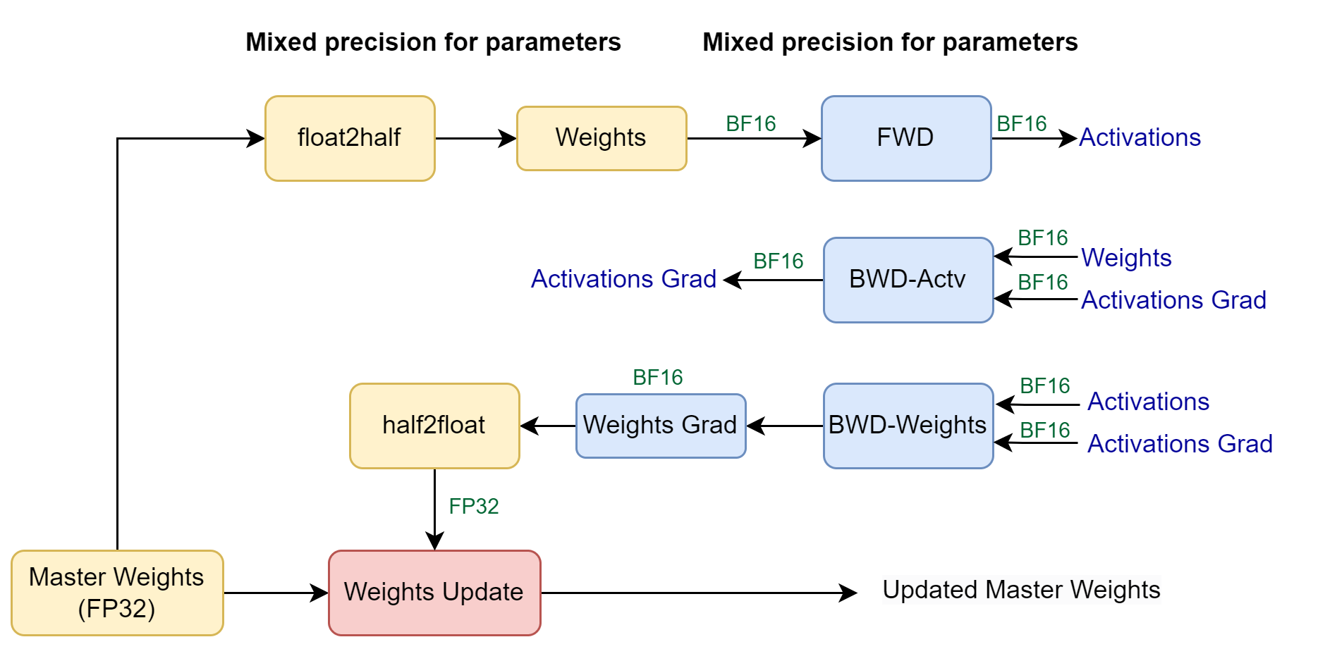 ● FSDP在本地会保存一份FP32的Weights,在执行forward和backward时会cast成低精度(FP16 / BF16)