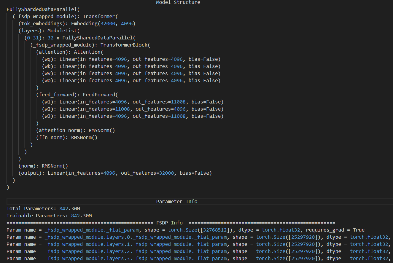 以LLama模型为例,如果指定TransformerLayer进行分片,则每个TransformerLayer都是一个FSDP单元,里面的LayerNorm, Attention, MLP的参数会被聚合、展平、分散到不同的设备上