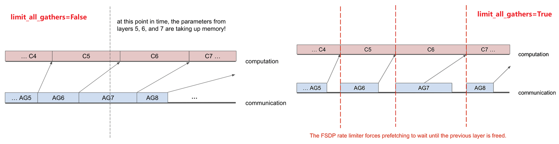 当FSDP单元的计算慢于 all-gather 通信时,如果不限制CPU 下发 all-gather 的速度,会导致设备内存中驻留多个 FSDP 单元的参数