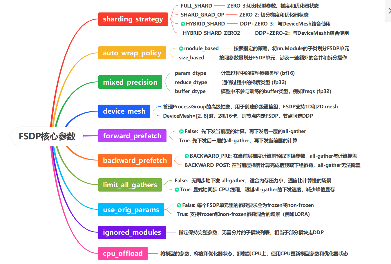 FSDP 通过多层配置实现了通信和计算的精细控制,主要有三点: