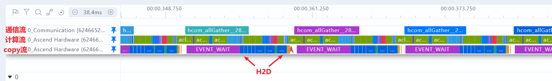 BACKWARD_POST:当前层的计算,仅与上一层的reduce-scatter重叠。如下图,执行all-gather的时候计算流正在等待(event_wait)