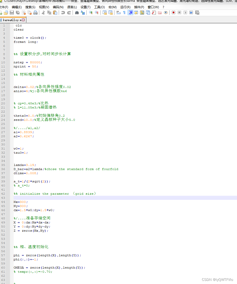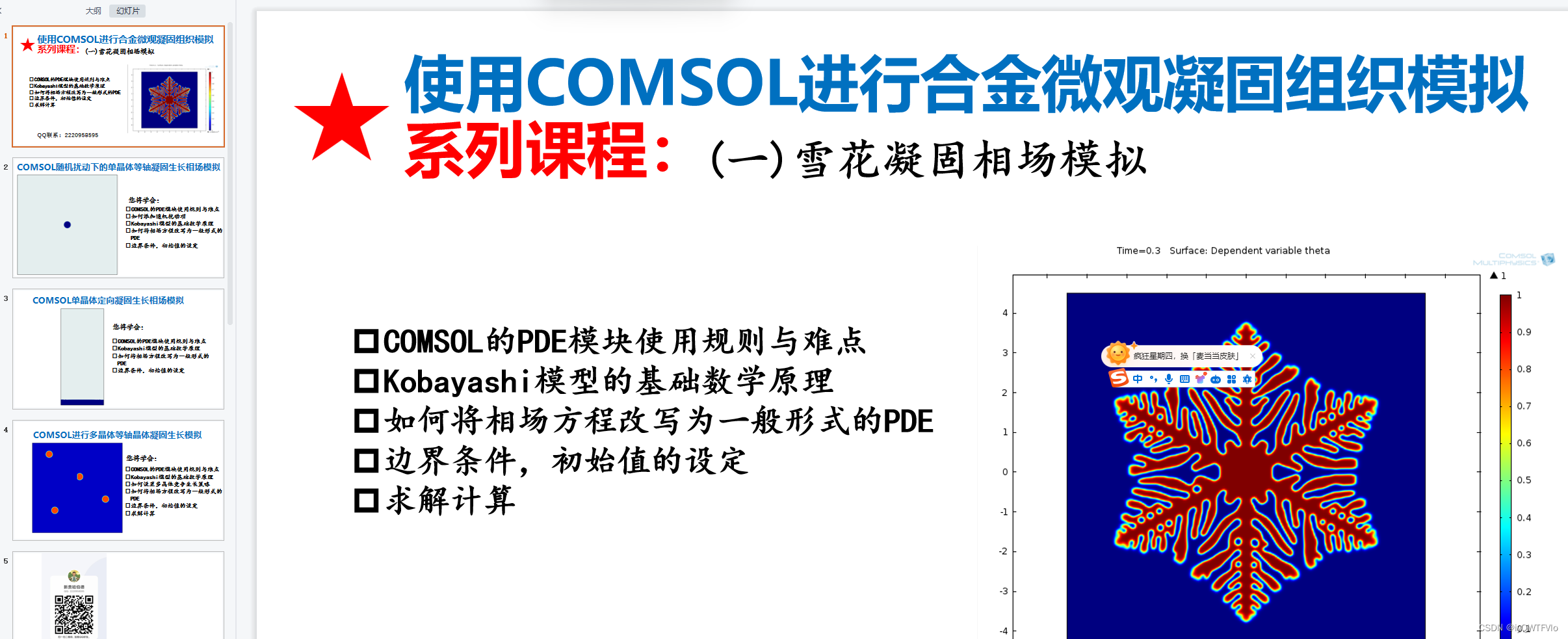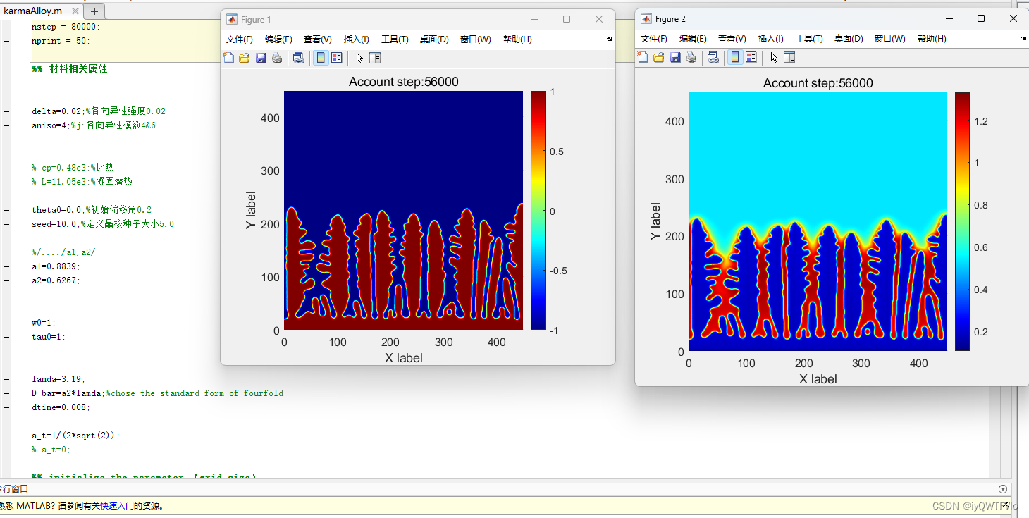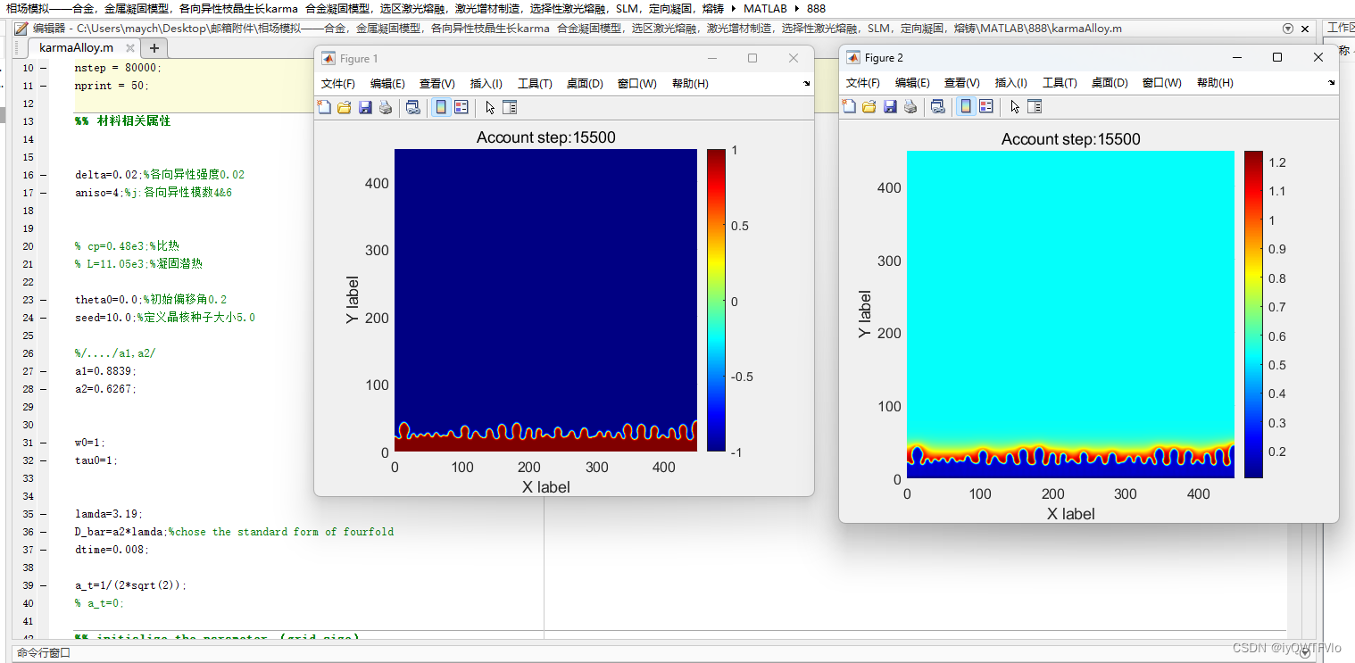 相场模拟------合金,金属凝固模型,各向异性枝晶生长karma 合金凝固模型,选区激光熔融,激光增材制造,选择性激光熔融,SLM,定向凝固,熔铸 1matlab,实现合金各向异性枝晶生长,代码注释详细,包学包会,直接运行得到下面的演化过程,提供相关详细文献资料,包括控制方程,求解方法 2comsol偏微分方程,雪花生长模型,纯金属枝晶生长模型,详细资料