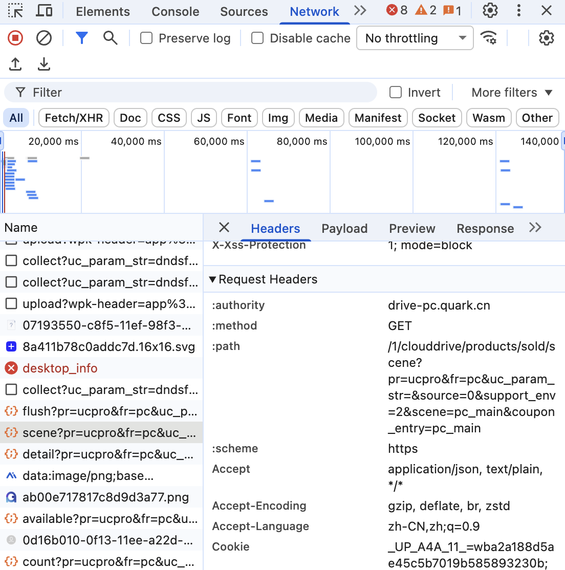 先登陆夸克网盘网页版,打开开发者工具(F12),在 Network 标签页中复制任意请求的 Cookie 值,粘贴到 access_tokens 数组中。