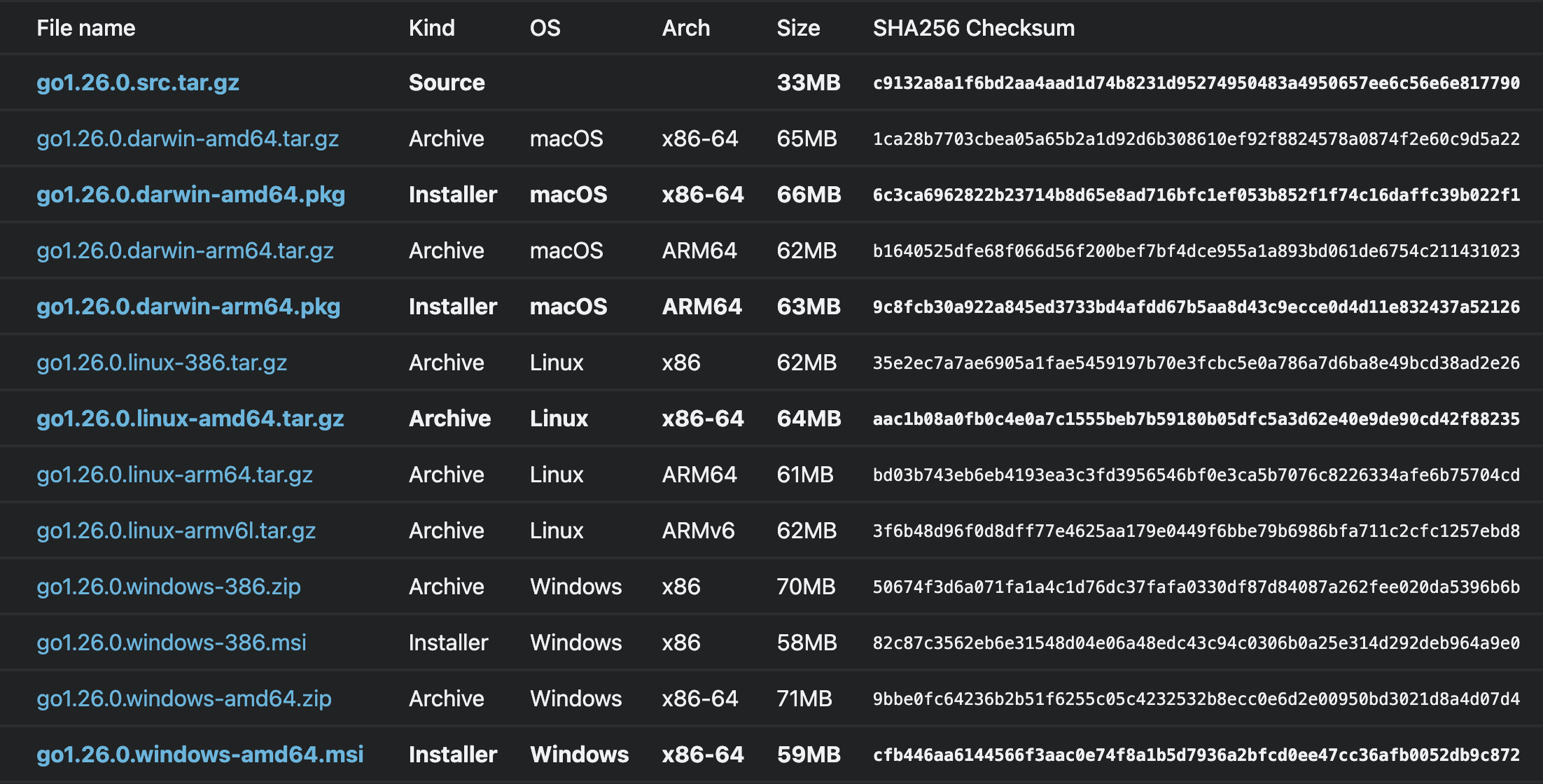 pythonwget https://go.dev/dl/go1.26.0.linux-amd64.tar.gz #国内镜像源 # 中国科技大学镜像 wget https://mirrors.ustc.edu.cn/golang/go.dev/dl/go1.26.0.linux-amd64.tar.gz # 阿里云镜像 wget https://mirrors.aliyun.com/golang/go.dev/dl/go1.26.0.linux-amd64.tar.gz -