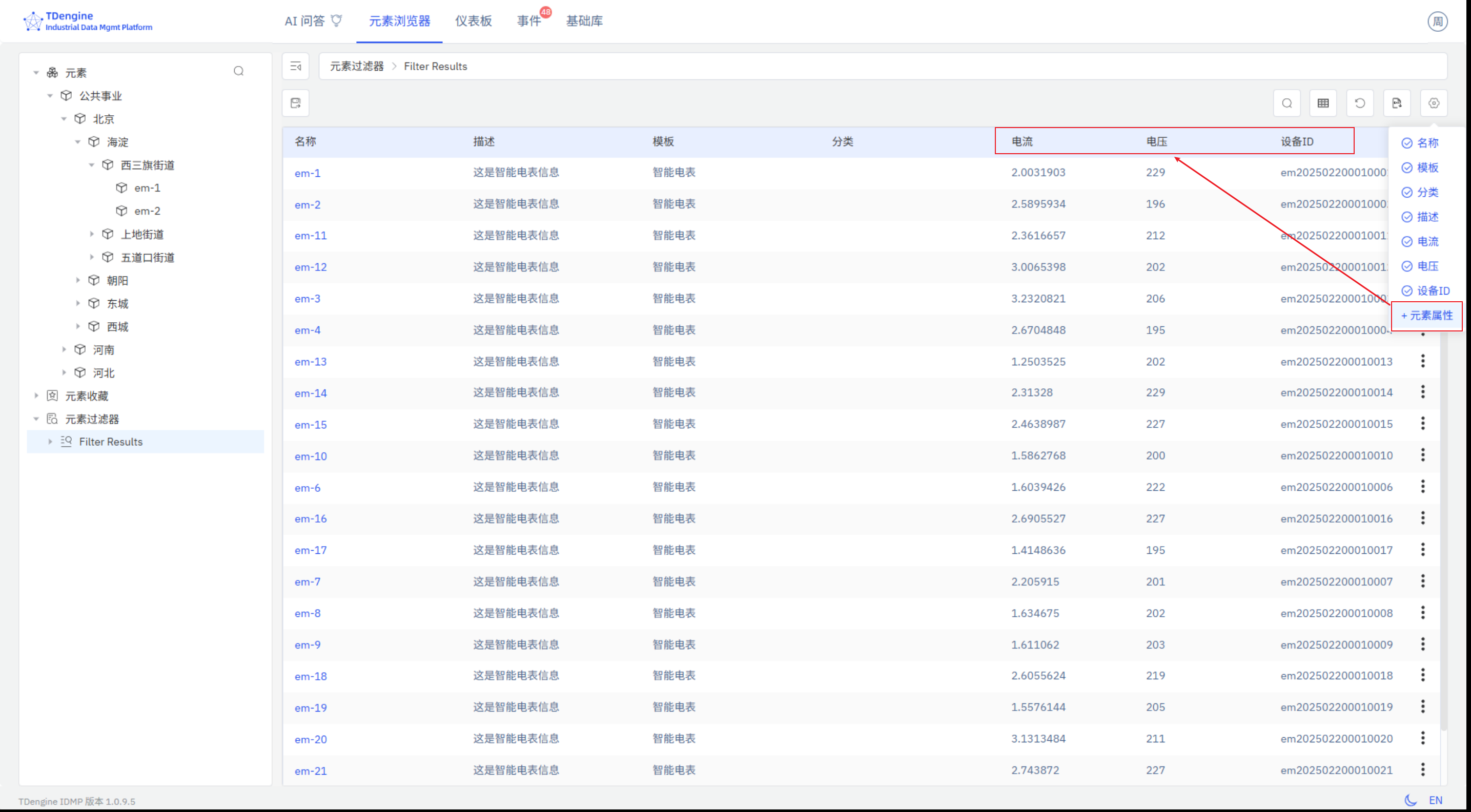 如果检索出的元素来自同一个元素模板,则可以添加元素属性到列表中;也可以点击现有的列名,去除不需要的列。