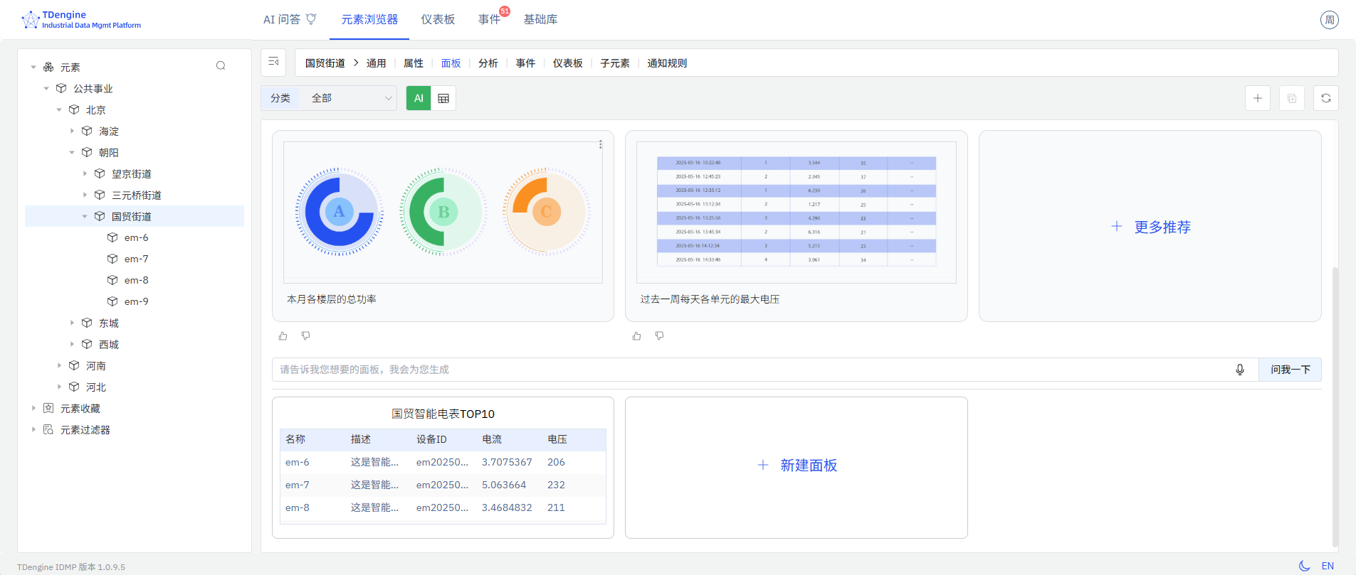 资产列表使用表格用来展示企业的资产信息及其最新状态和采集值。资产列表作为面板的一种类型,可以单独保存为某个元素下的资产列表面板,也可以添加到仪表板中。