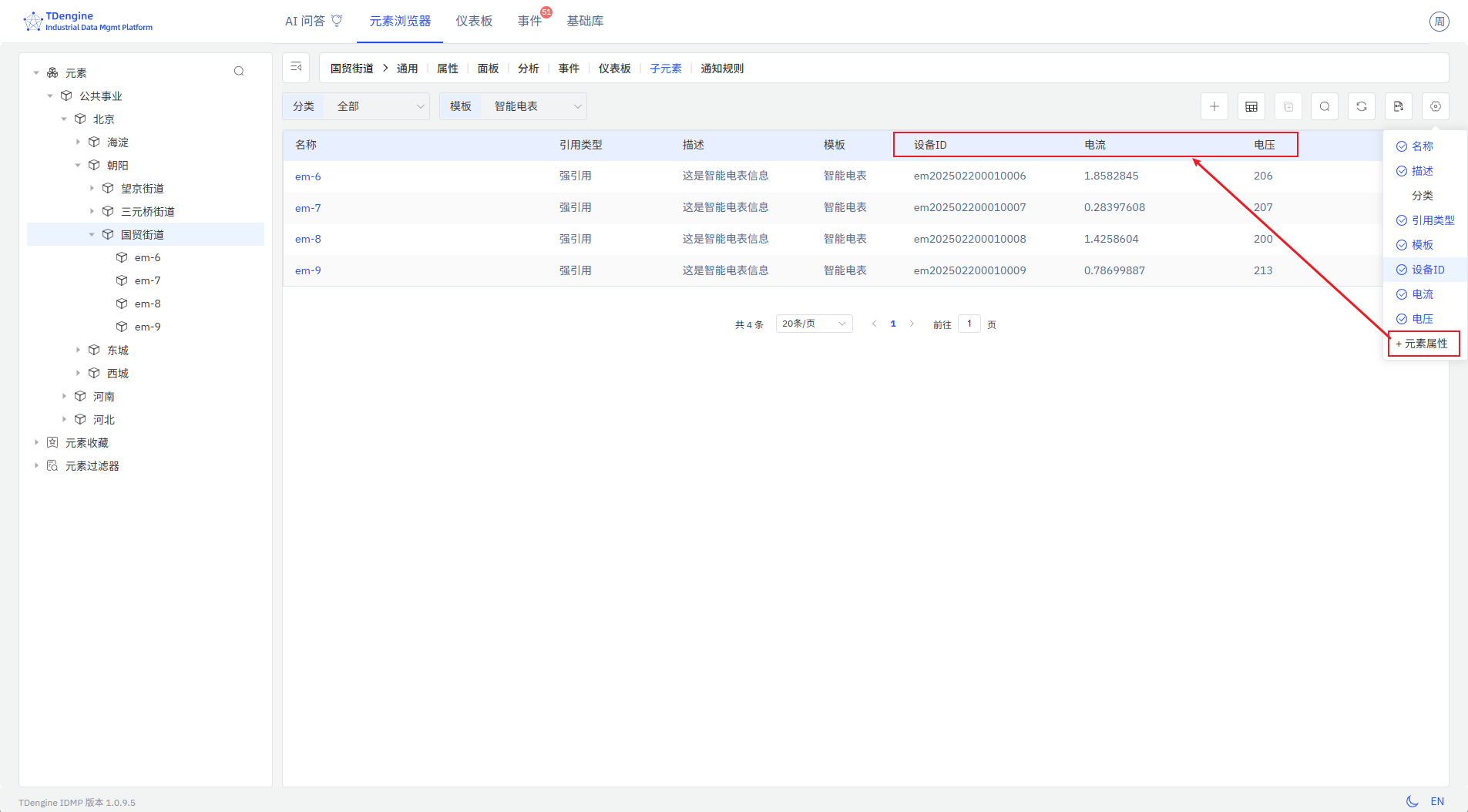 在左侧选择某个元素后,点击动作区的"子元素列表"图标,进入子元素列表页面。如果所有子元素都来自同一个元素模板,则可以添加元素属性到列表中;也可以点击现有的列名,去除不需要的列。