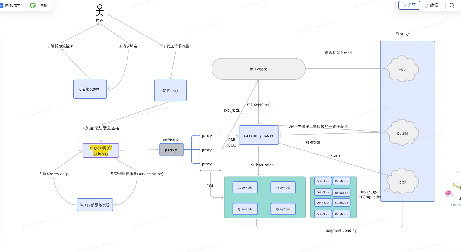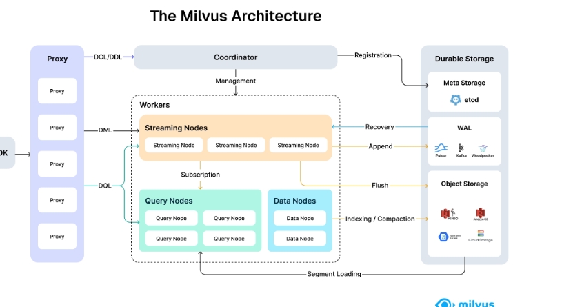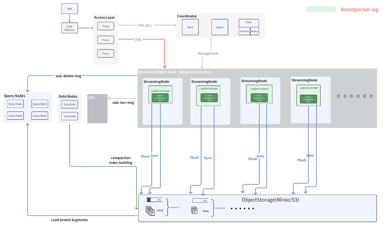 接收来自 Proxy 的写入请求(如 insert、delete 等),并将数据以流的形式写入 WAL(Write-Ahead Log)和 Object Storage。