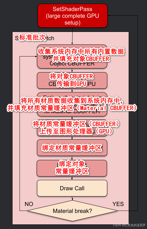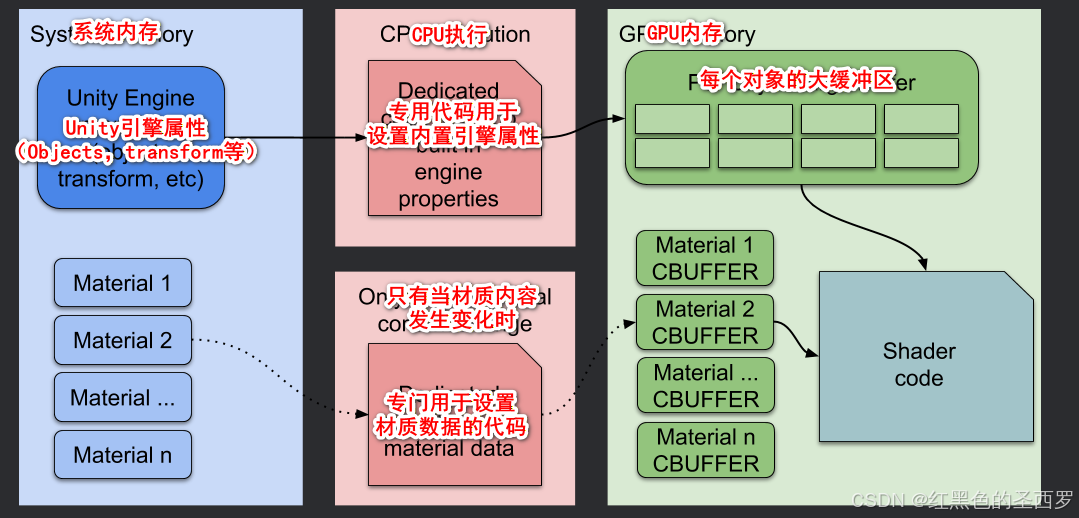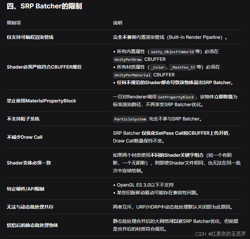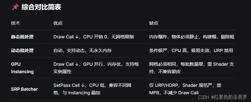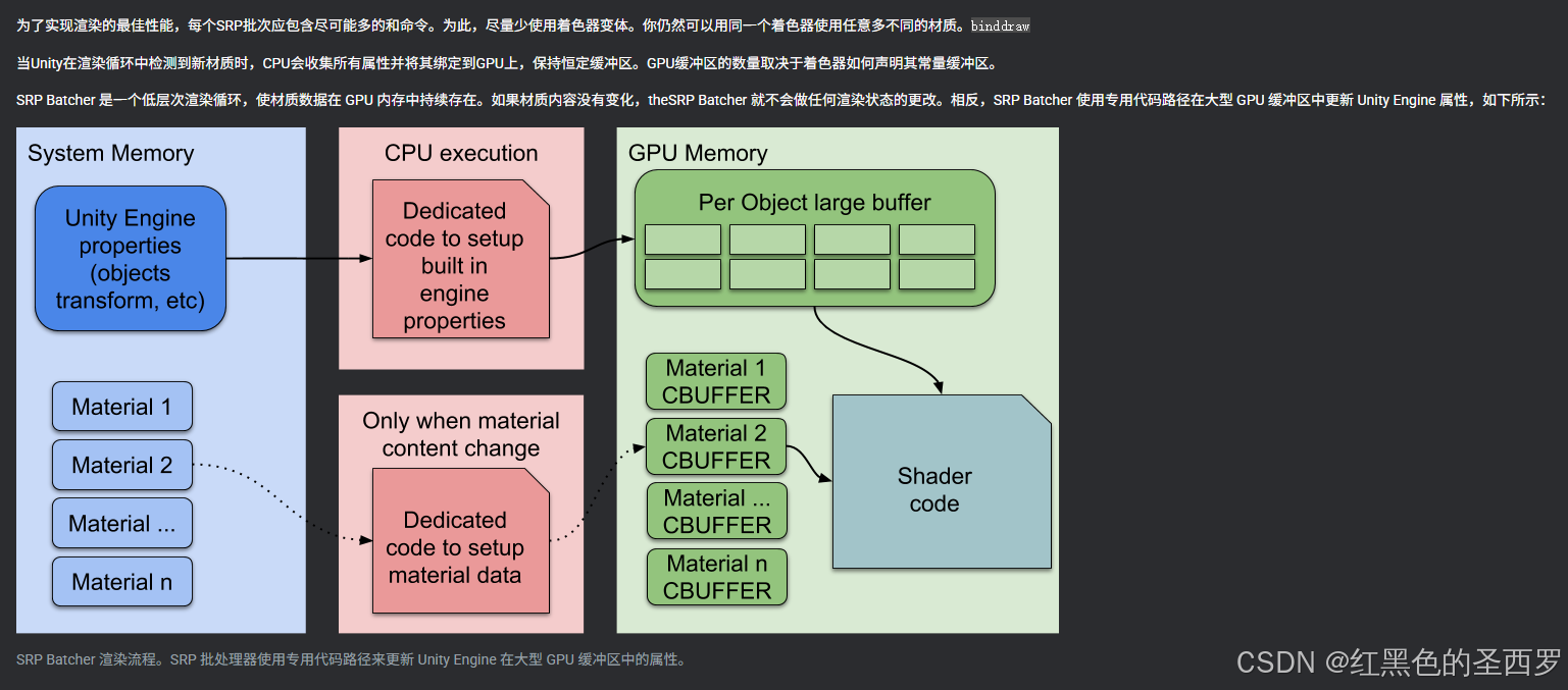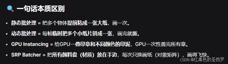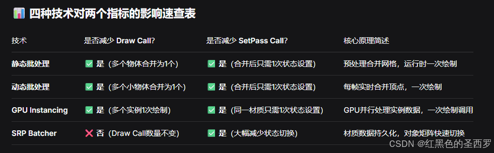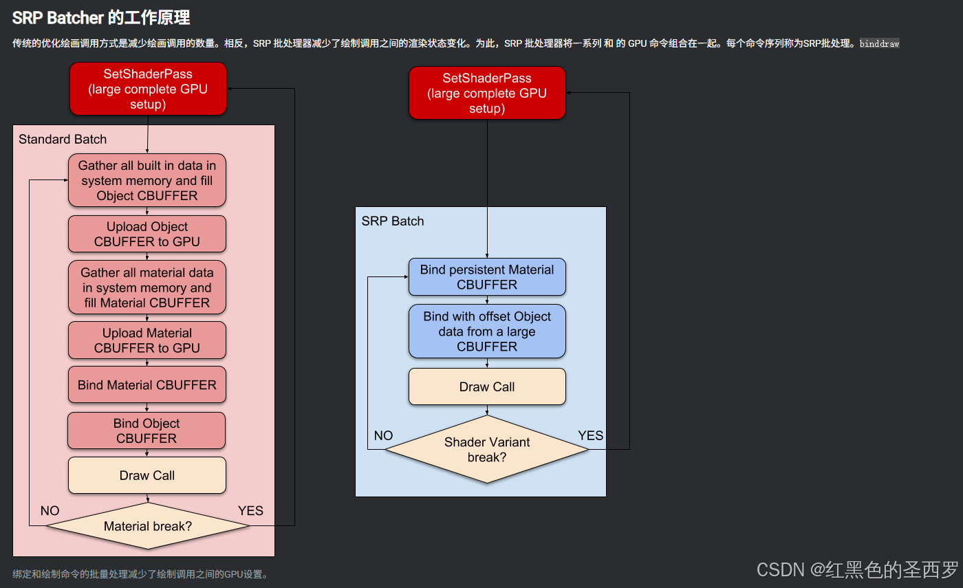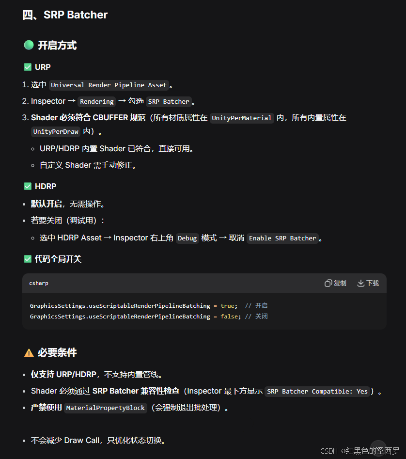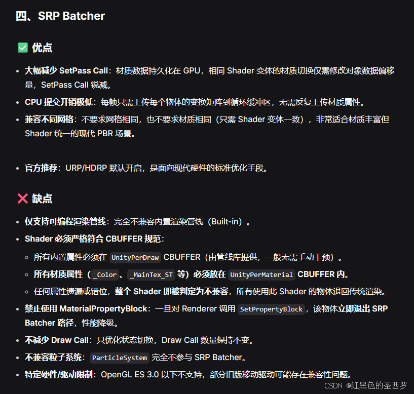 | SRP Batcher | 持久化材质状态 + 快速切换对象数据:将材质的Shader属性存储在GPU的持久缓冲区中,每帧仅上传每个对象的变换矩阵到循环缓冲区,绘制时通过对象ID快速索引 | 初始化时:材质数据上传GPU并常驻 每帧:对象变换矩阵 → 循环缓冲区 → 多次DrawCall (但每次仅设置对象偏移) |
