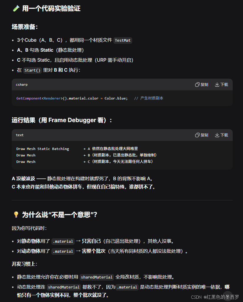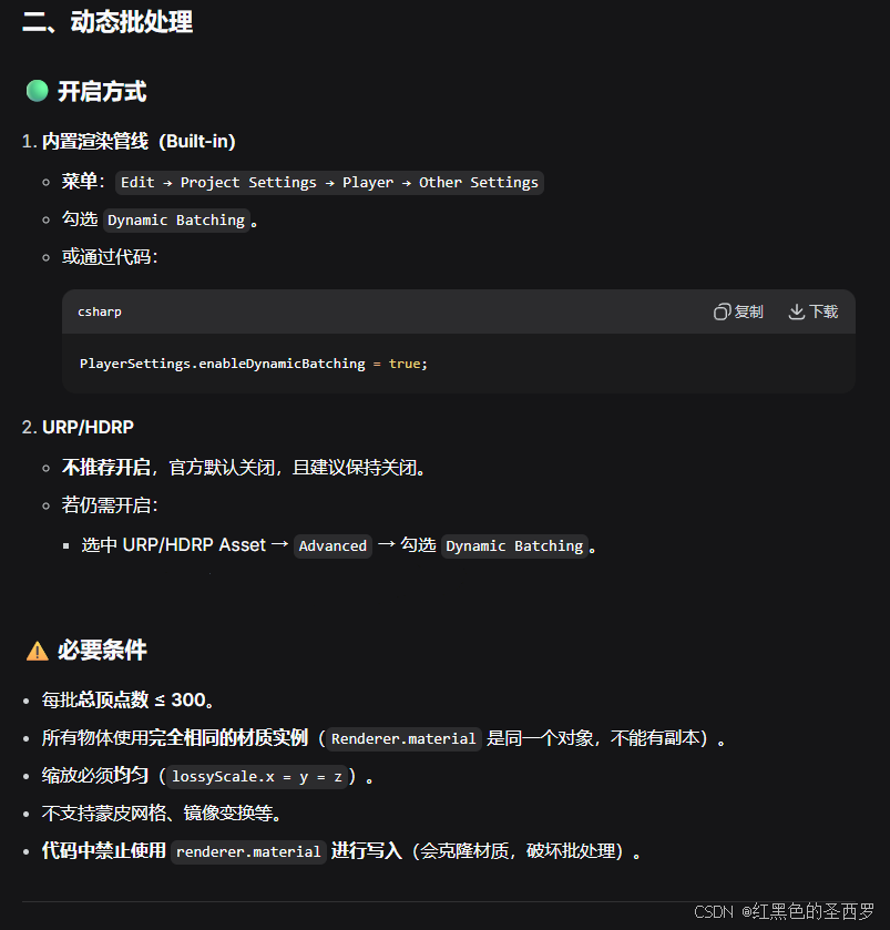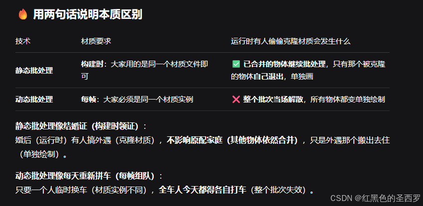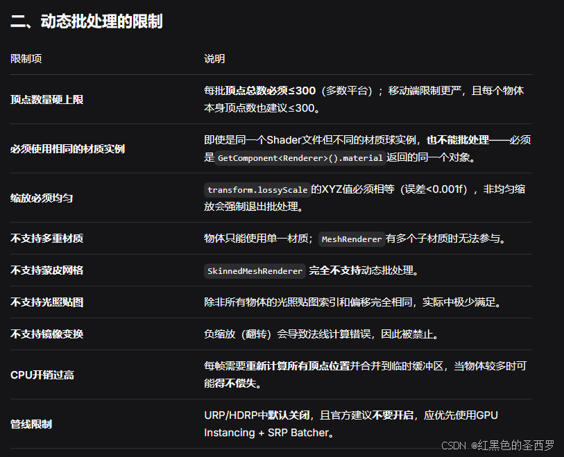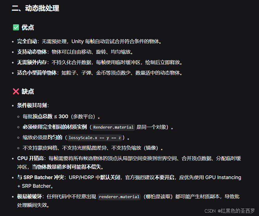 | 动态批处理 | 实时合并小网格:每帧在CPU端,将多个满足严格条件的小型动态物体的顶点数据实时计算并合并到临时缓冲区,提交一次绘制 | 每帧:收集候选 → 检查条件 → 计算世界坐标 → 合并顶点 → 绘制 → 丢弃临时数据 |