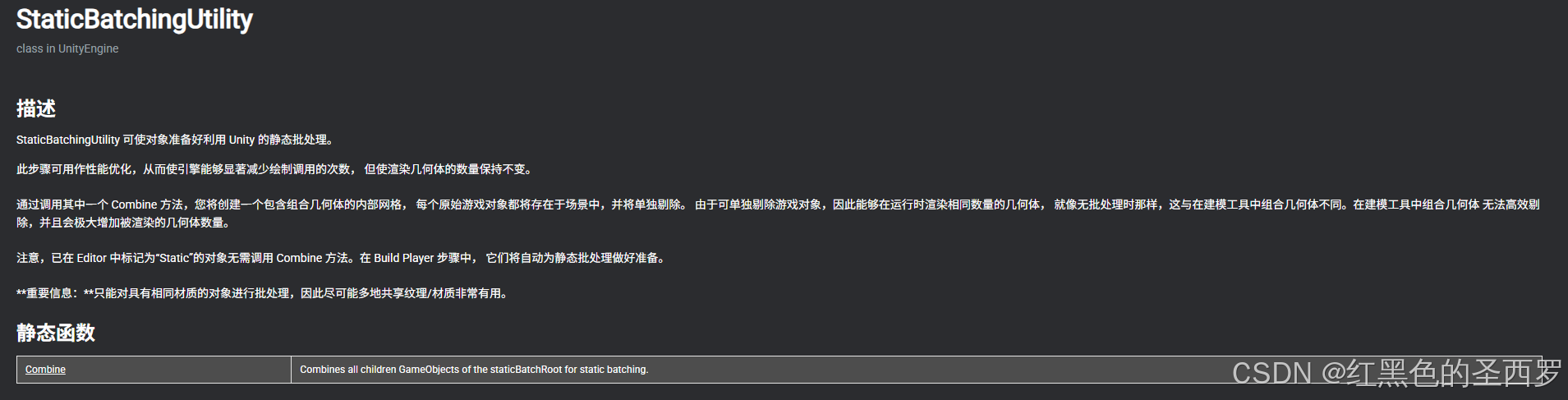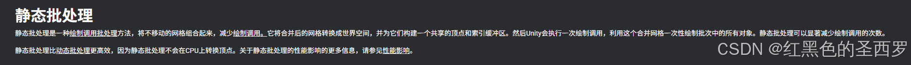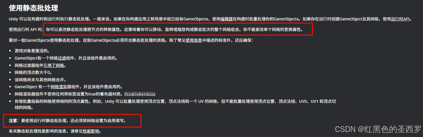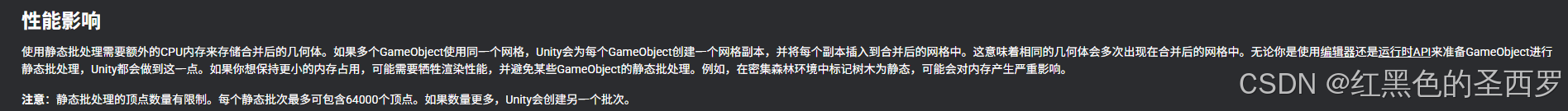 即静态批处理的顶点的转换不会在CPU上进行 ,且静态批处理是先将网格合并,再转换到世界空间,并为它们构建一个共享的顶点和索引缓冲区