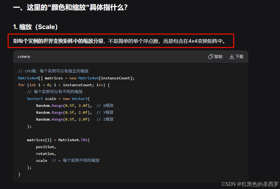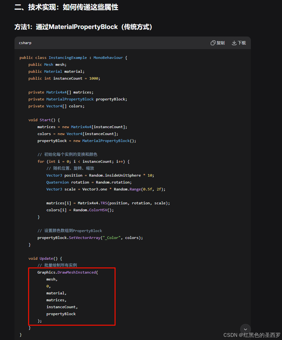 注意,根据官方文档,Graphics.DrawMeshInstanced方法已经过时,需要使用 Graphics.RenderMeshInstanced 替代,注意,此API一次最多渲染1023个实例