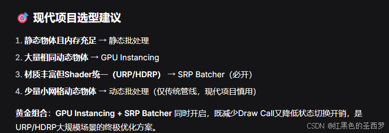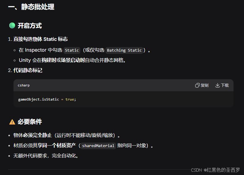 | 静态批处理 | 预处理合并网格:在构建时或运行时启动阶段,将多个静态物体的网格永久合并成一个大网格,顶点坐标变换到世界空间 | 构建时:收集物体 → 合并网格 → 存储为资产 运行时:一次DrawCall |