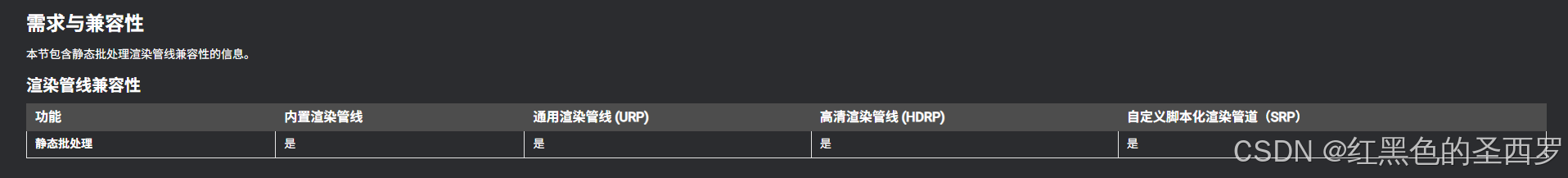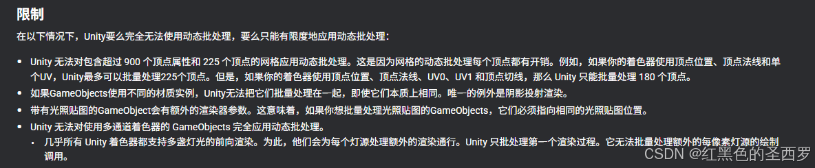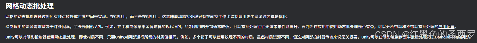 处理方式为将所有顶点转换到世界空间 ,这里与静态批处理不同,消耗主要是在CPU上,并且这里还指明了一点,即对于阴影投射器,物体本身的材质可以不同,但阴影依旧可以批量处理