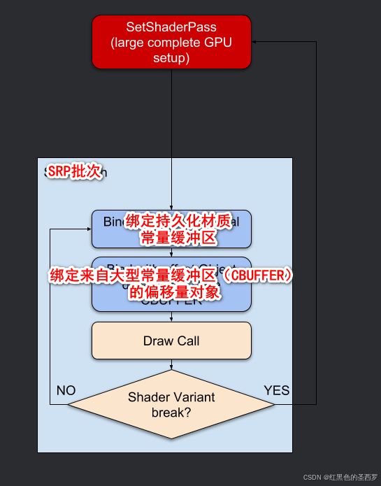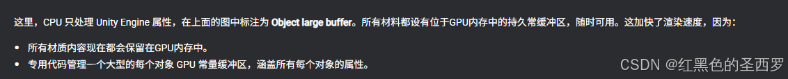 即SRP Batcher的最核心原理就是缓存区,将渲染状态数据存储在GPU的缓存区中,从而加快了渲染速度,且Shader变体需要相同才能被批处理