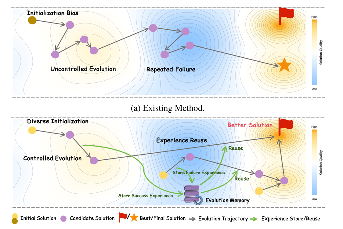 - 相关工作:该问题的研究相关工作有自进化方法(如AlphaEvolve和SE-Agent),这些方法通过"生成-验证-细化"循环来提高代码质量,但由于无指导的随机探索,探索效率低下。