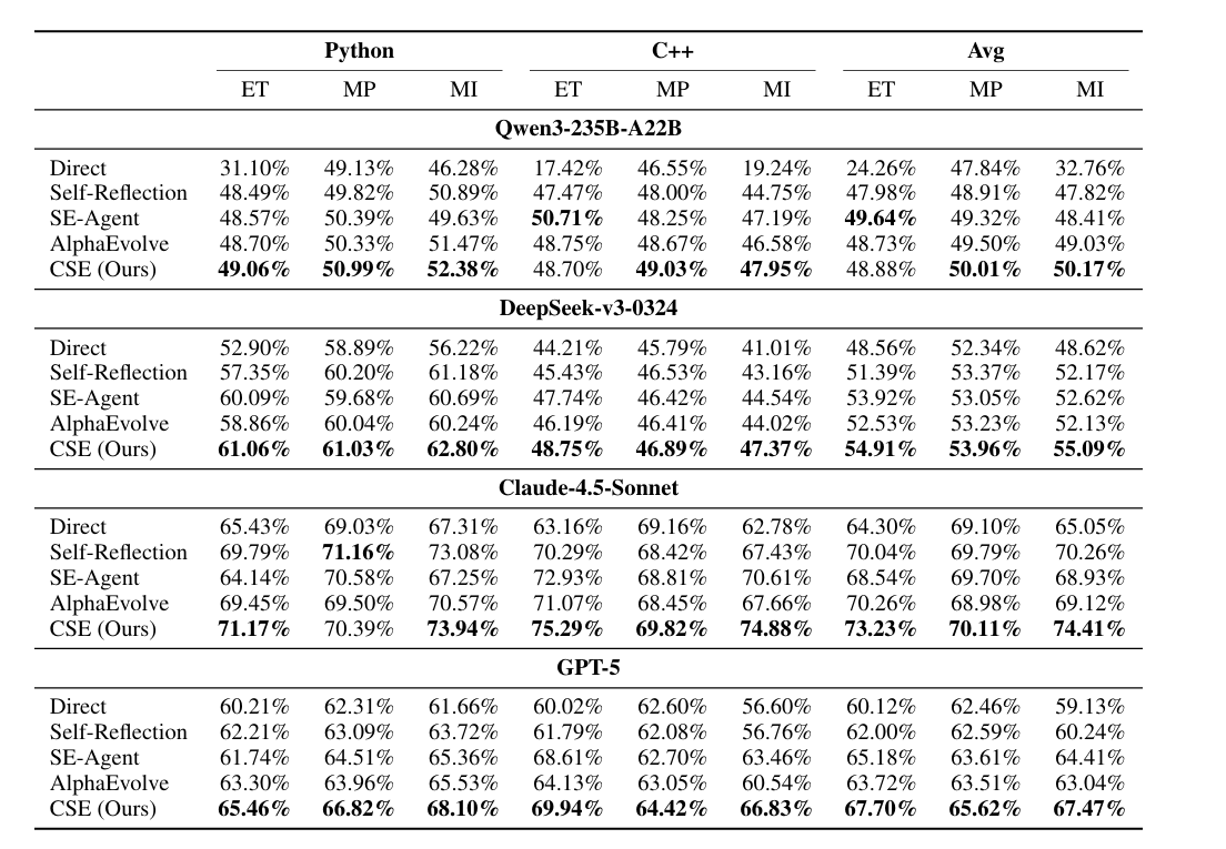 - 主要结果:CSE在大多数效率指标上均优于所有基线方法,特别是在内存积分上表现突出,表明其在有限探索预算内发现算法高效解决方案的能力。