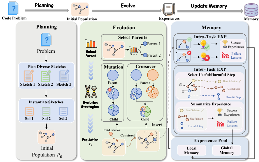 分层进化记忆:分层总结任务和跨任务的经验,为进化过程提供搜索指导。具体步骤包括: