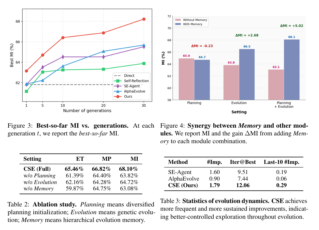 - 消融研究:移除多样化规划、遗传进化和分层进化记忆后,CSE的性能显著下降,表明这三个组件对CSE的有效性至关重要。