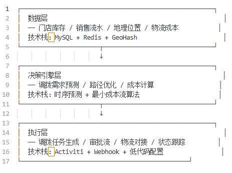| 便利店 | 高频小批量,就近调拨 | 距离权重70% + 库存余量权重30% |