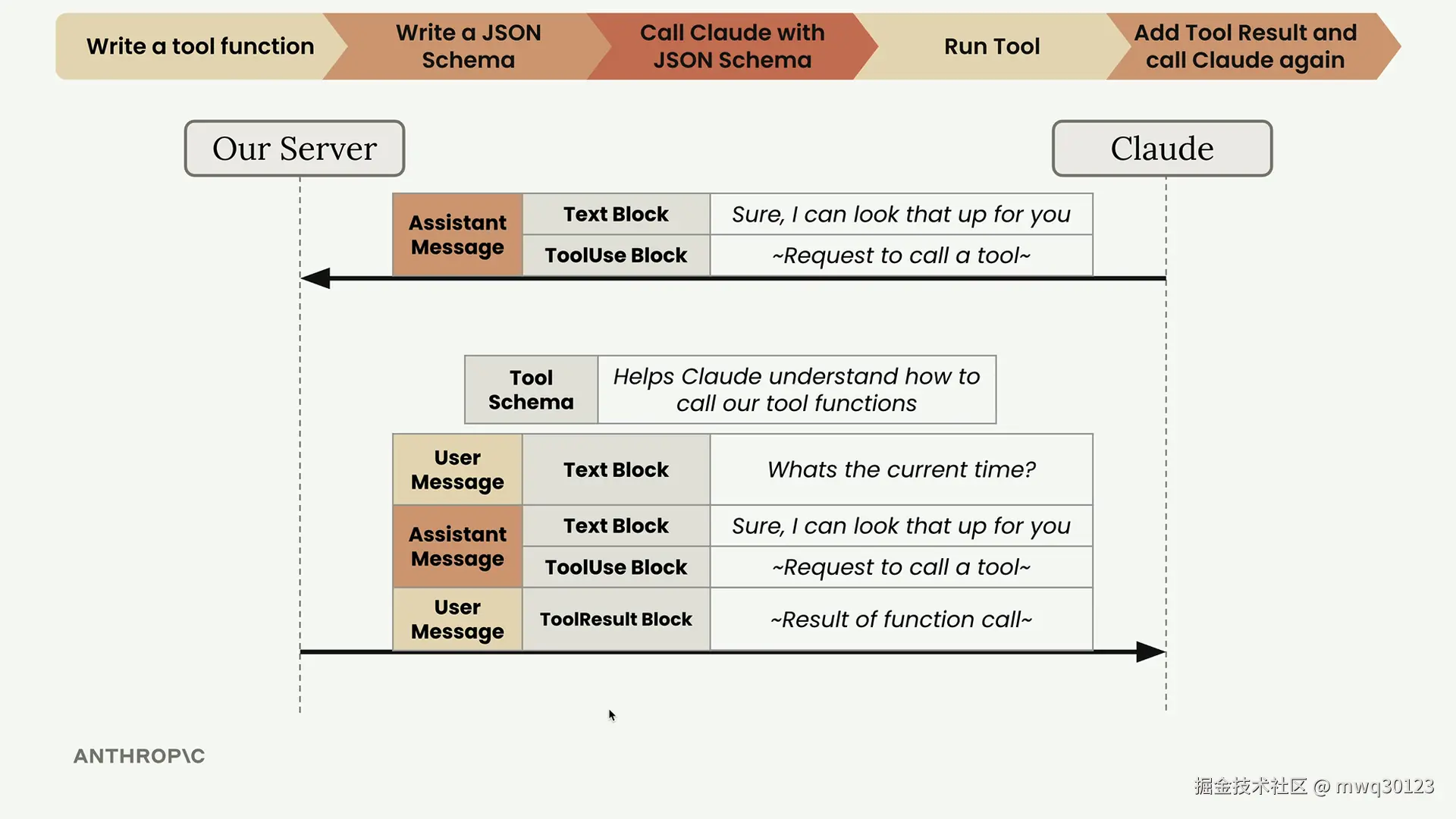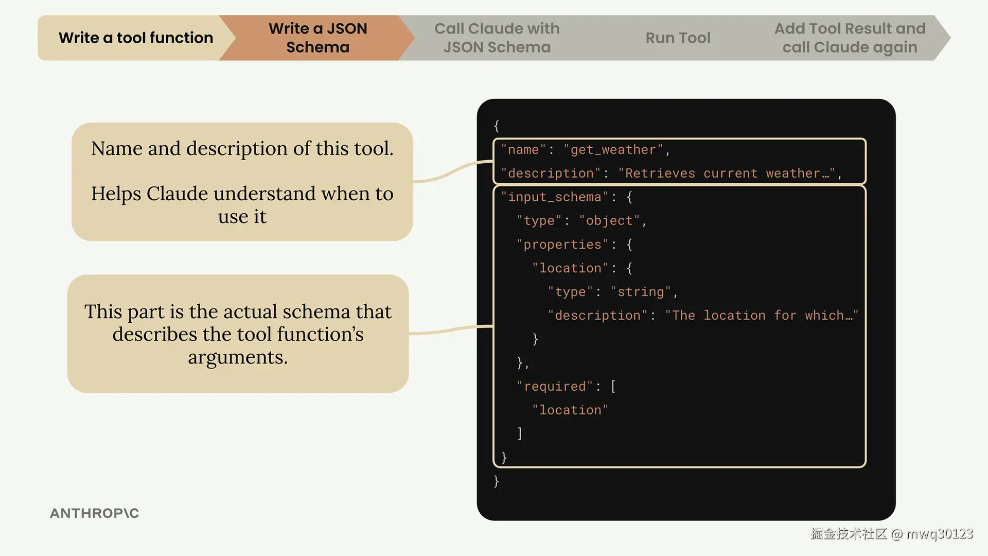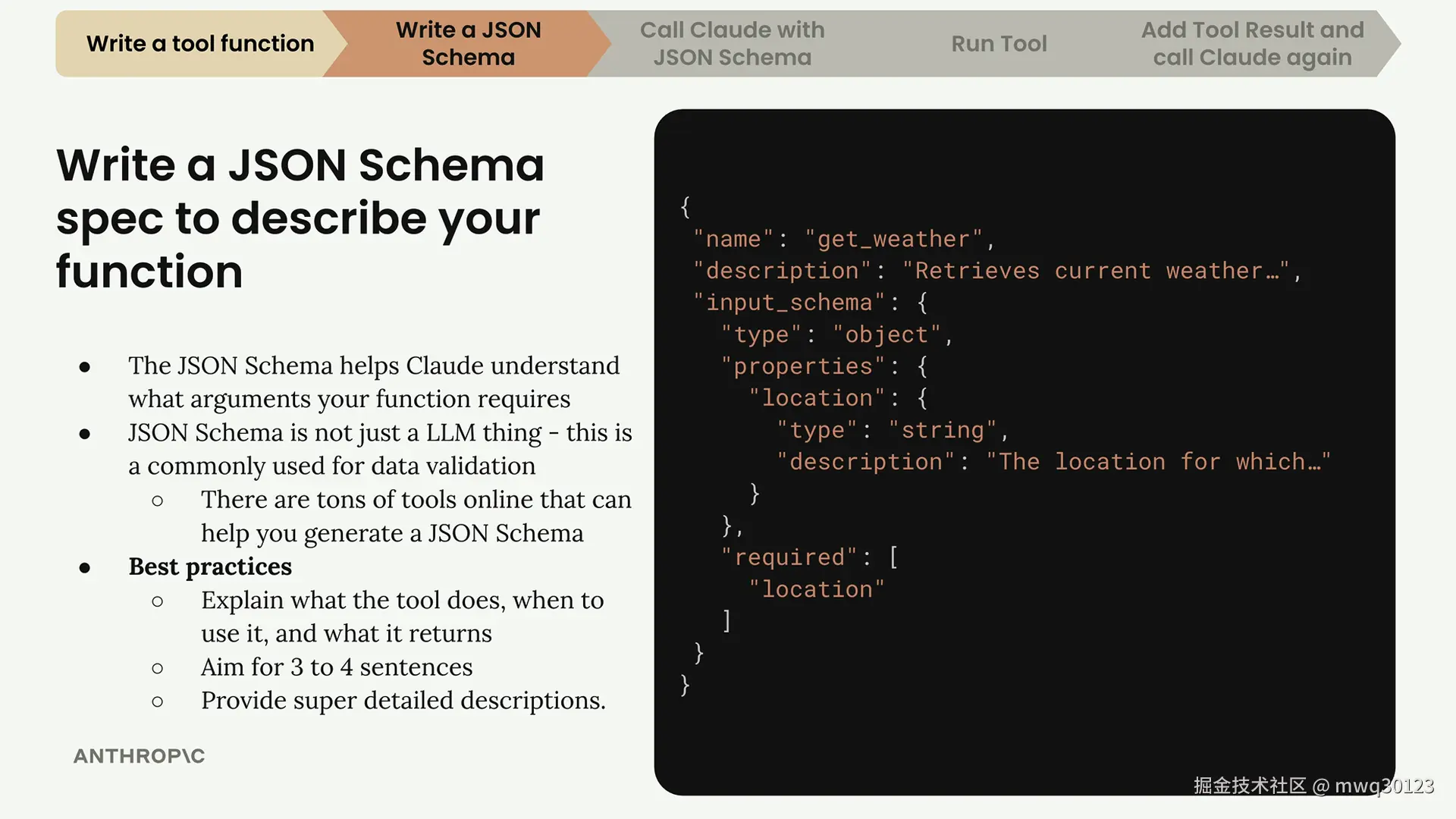 编写完工具函数后,下一步是创建一个 JSON schema,告诉 Claude 你的函数需要哪些参数以及如何使用它。这个 schema 相当于一份文档,Claude 通过阅读它来了解何时以及如何调用你的工具。