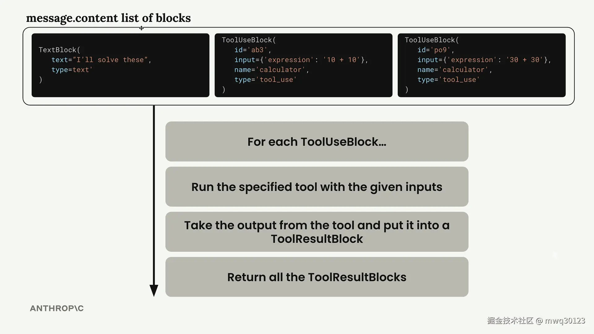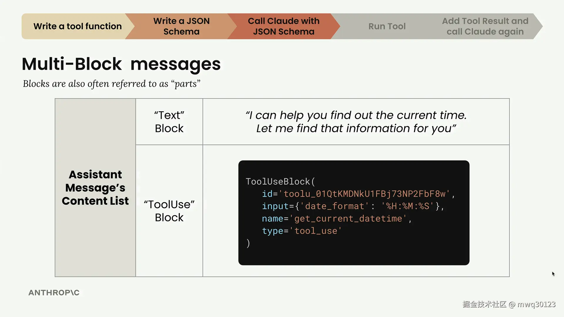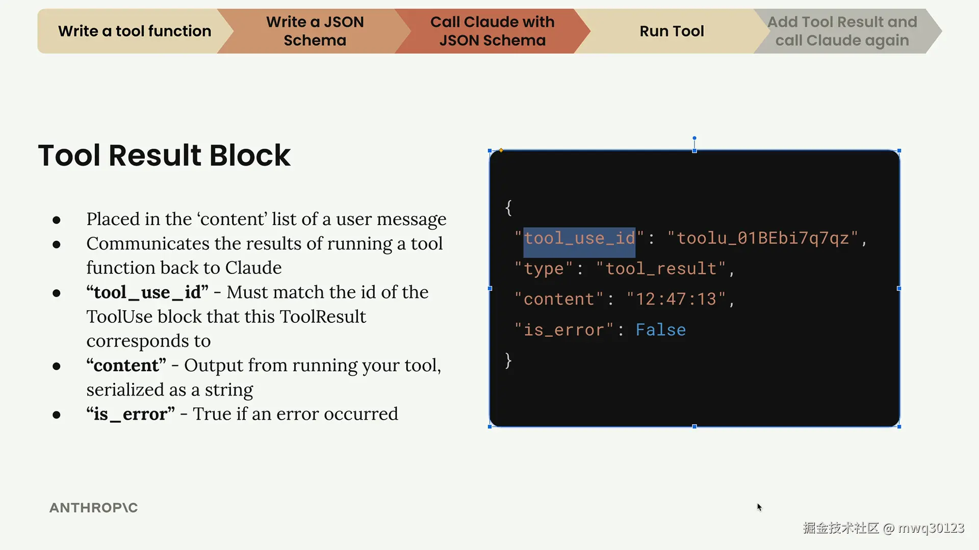 编写完工具函数后,下一步是创建一个 JSON schema,告诉 Claude 你的函数需要哪些参数以及如何使用它。这个 schema 相当于一份文档,Claude 通过阅读它来了解何时以及如何调用你的工具。