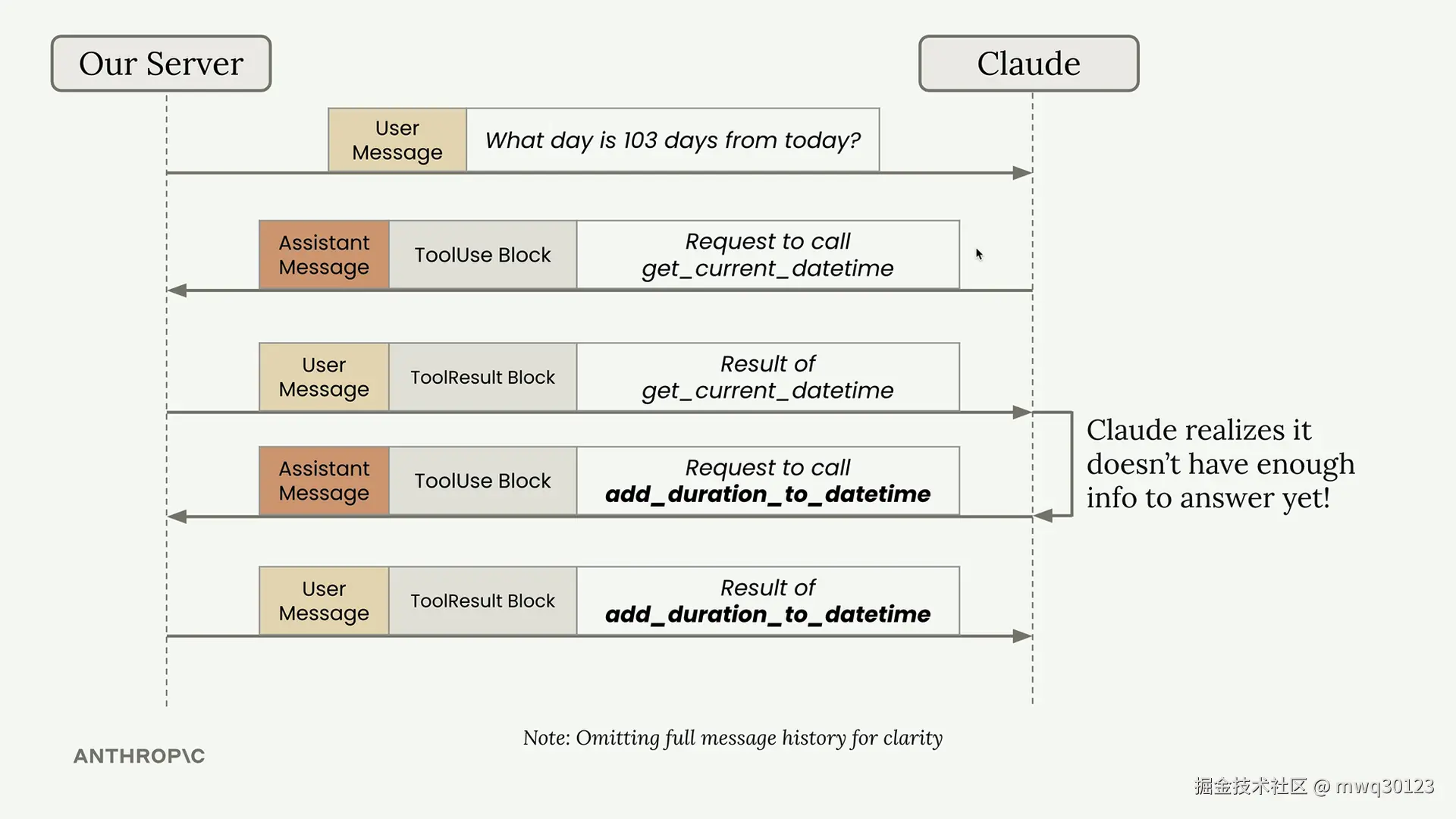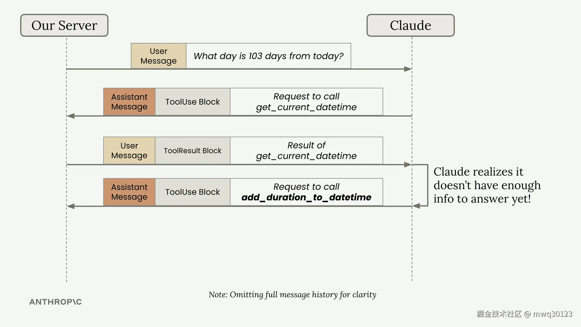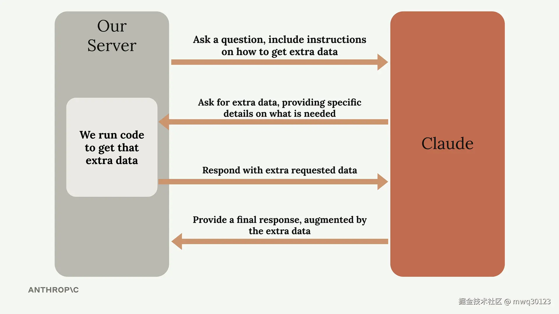 1. 初始请求: 您向 Claude 发送问题,并附上如何从外部来源获取额外数据的说明