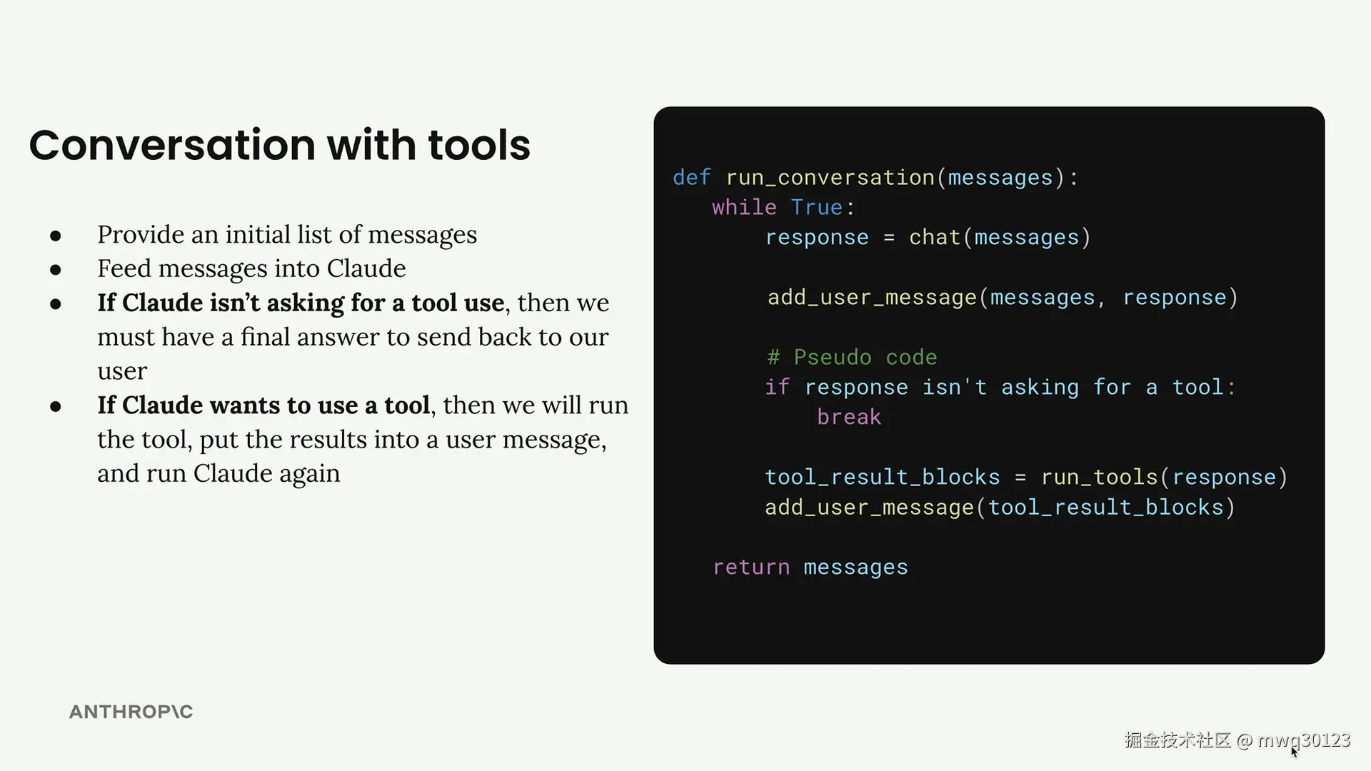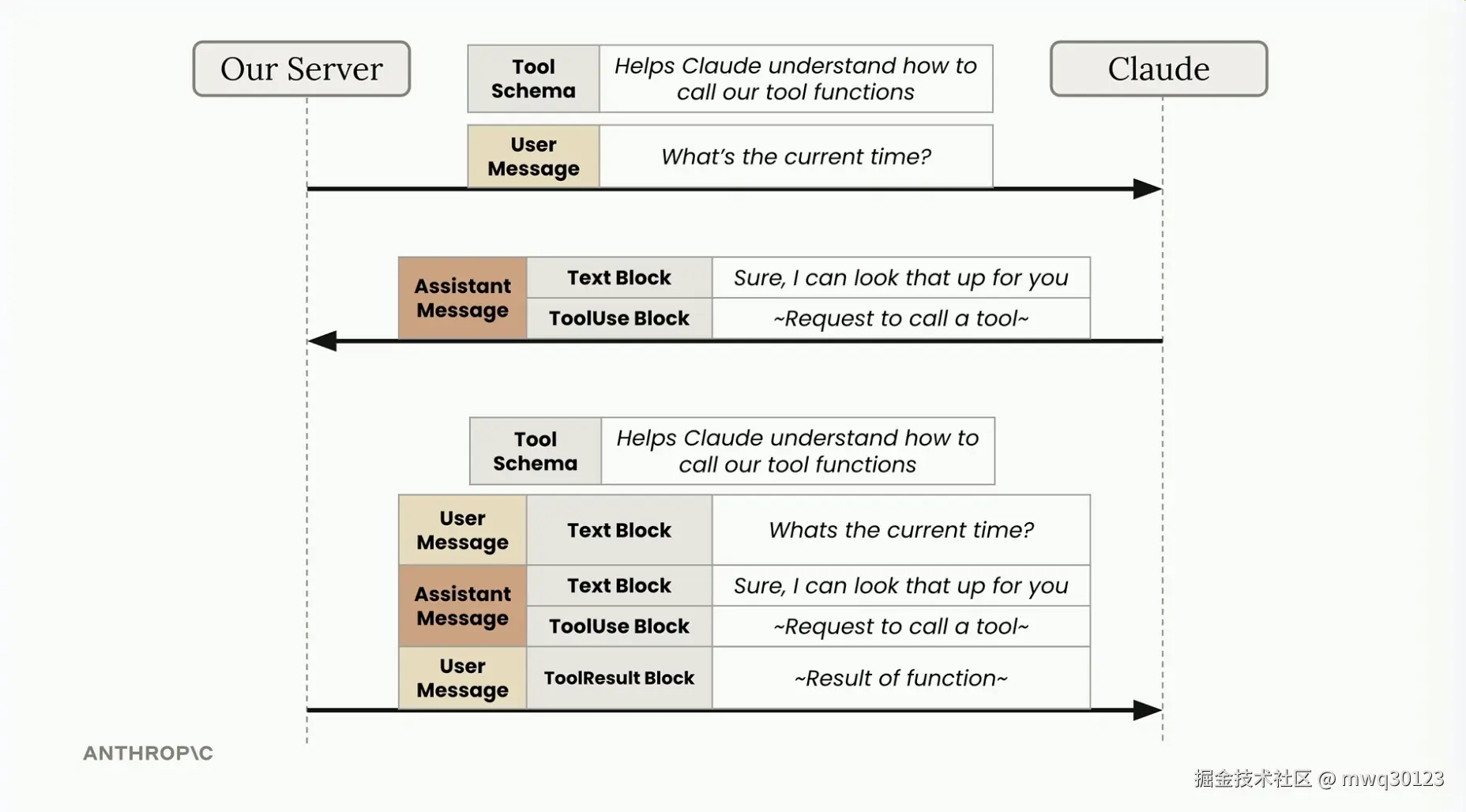 工具函数是一个普通的 Python 函数,当 Claude 判断需要额外信息来帮助用户时,它会自动执行该函数。例如,如果有人问"现在几点了?",Claude 就会调用你的日期/时间工具来获取当前时间。