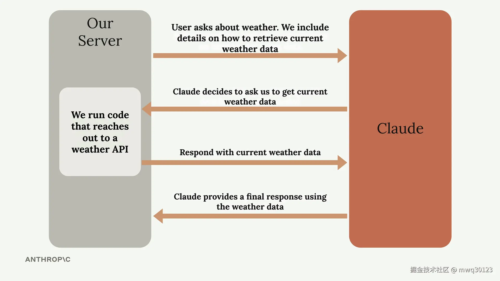 当用户询问当前天气时,你在提示词中包含了如何获取天气数据的说明。Claude 识别出它需要当前信息,并请求获取特定位置的天气数据。然后你的服务器调用天气 API 获取实时状况,并将该数据发送回 Claude。最后,Claude 将最新的天气数据与用户的问题结合起来,提供准确、及时的回复。