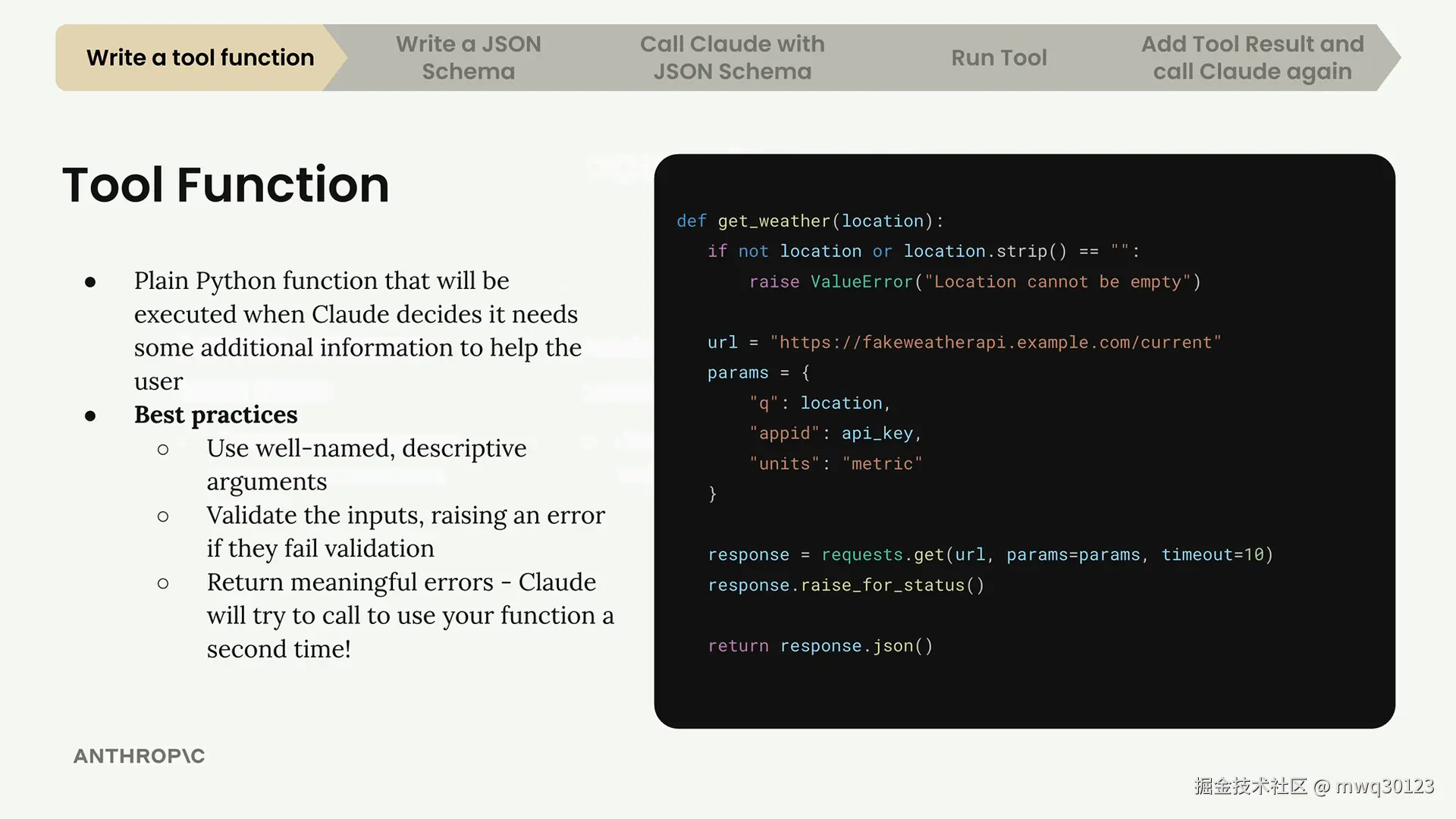 以下是一个天气工具函数的示例。请注意它如何验证输入并提供清晰的错误消息------这些都是重要的最佳实践。