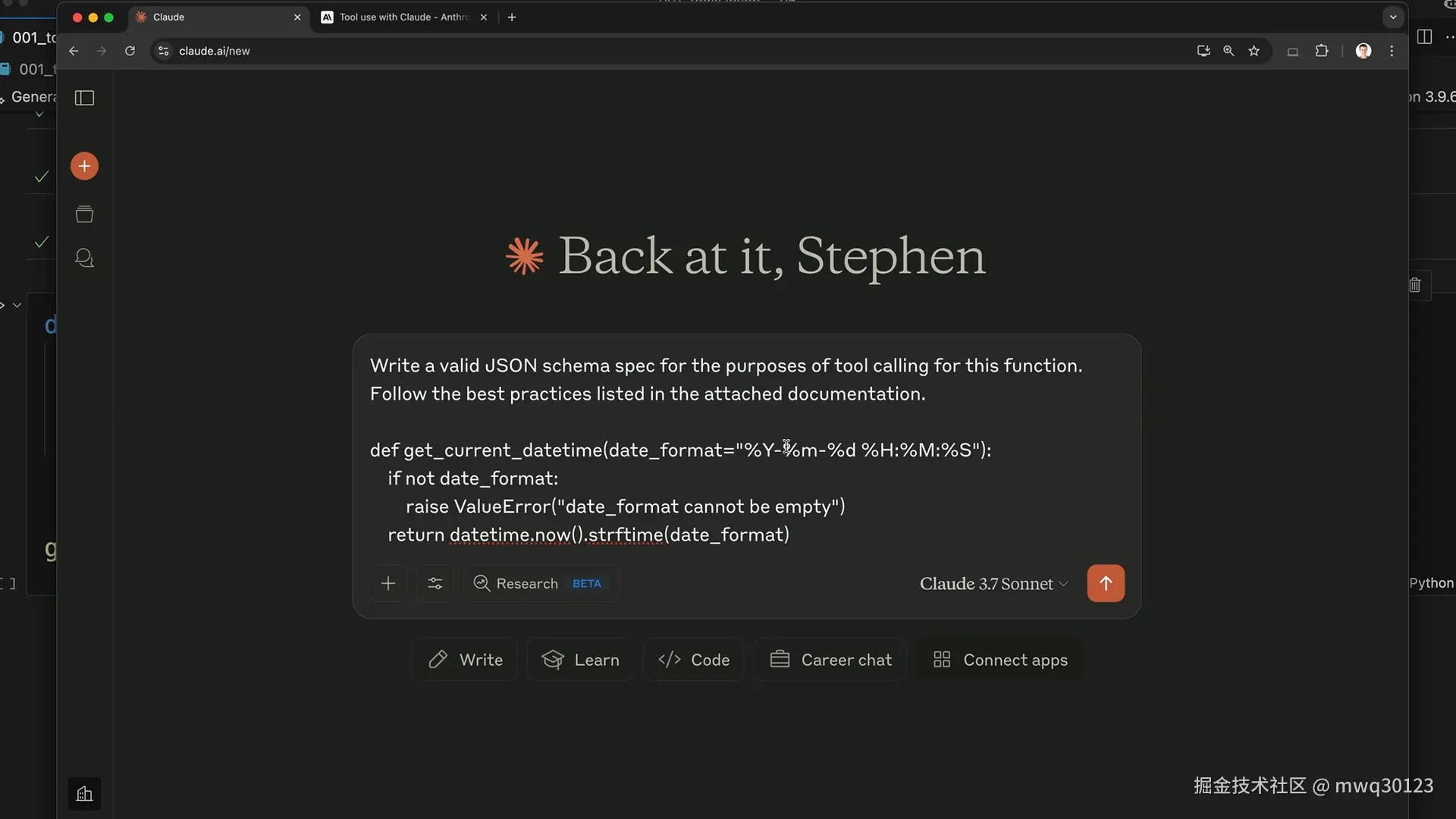 - 前往 Claude,让它编写一个用于工具调用的 JSON schema
