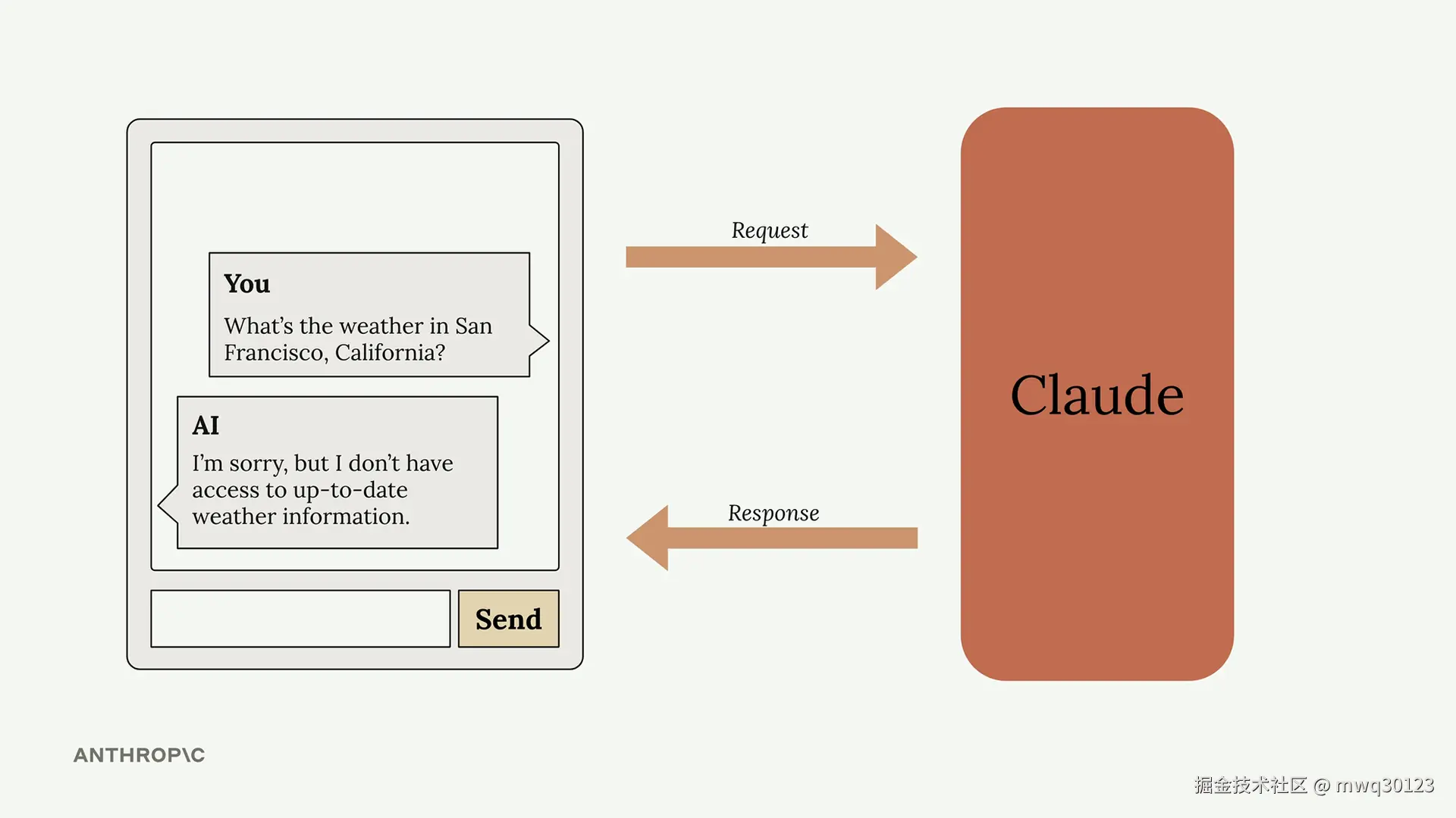 当用户向 Claude 询问当前信息时,它会遇到障碍。例如,如果有人问"加利福尼亚州旧金山的天气怎么样?"Claude 只能回复类似"抱歉,我无法获取最新的天气信息。"这样的内容。