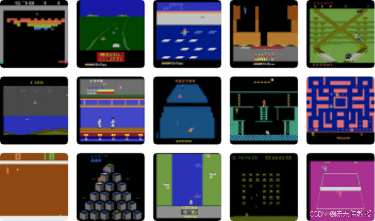 Atari 游戏是 20 世纪 70-80 年代电子游戏产业的代表。它是一系列游戏的集合,这些游戏画面简洁、规则简单、目标单一,难度会随着时间逐渐增加,以鼓励玩家追求更高的分数。Atari 游戏种类繁多,如球类、射击类、迷宫类、竞速类和平台跳跃类等,是早期街机游戏的典型代表。