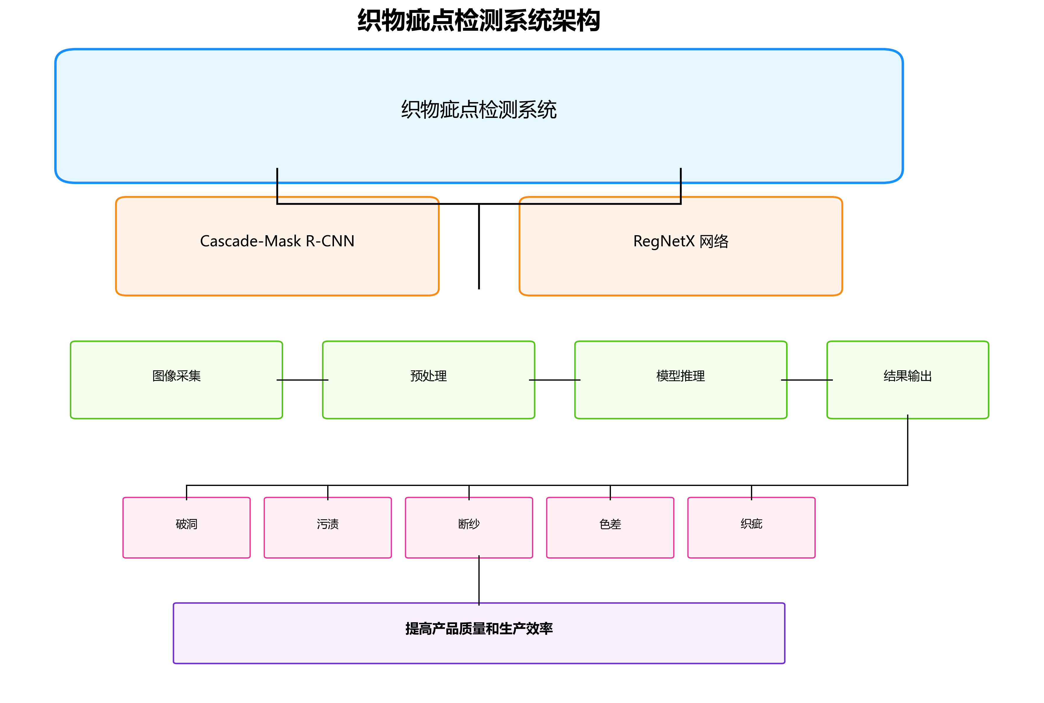 织物疵点检测是纺织行业质量控制的关键环节,深度学习技术的应用为这一难题提供了有效的解决方案。本文提出的Cascade-Mask-RCNN_RegNetX模型在保持高精度的同时,实现了较好的实时性能,满足了工业应用的需求。