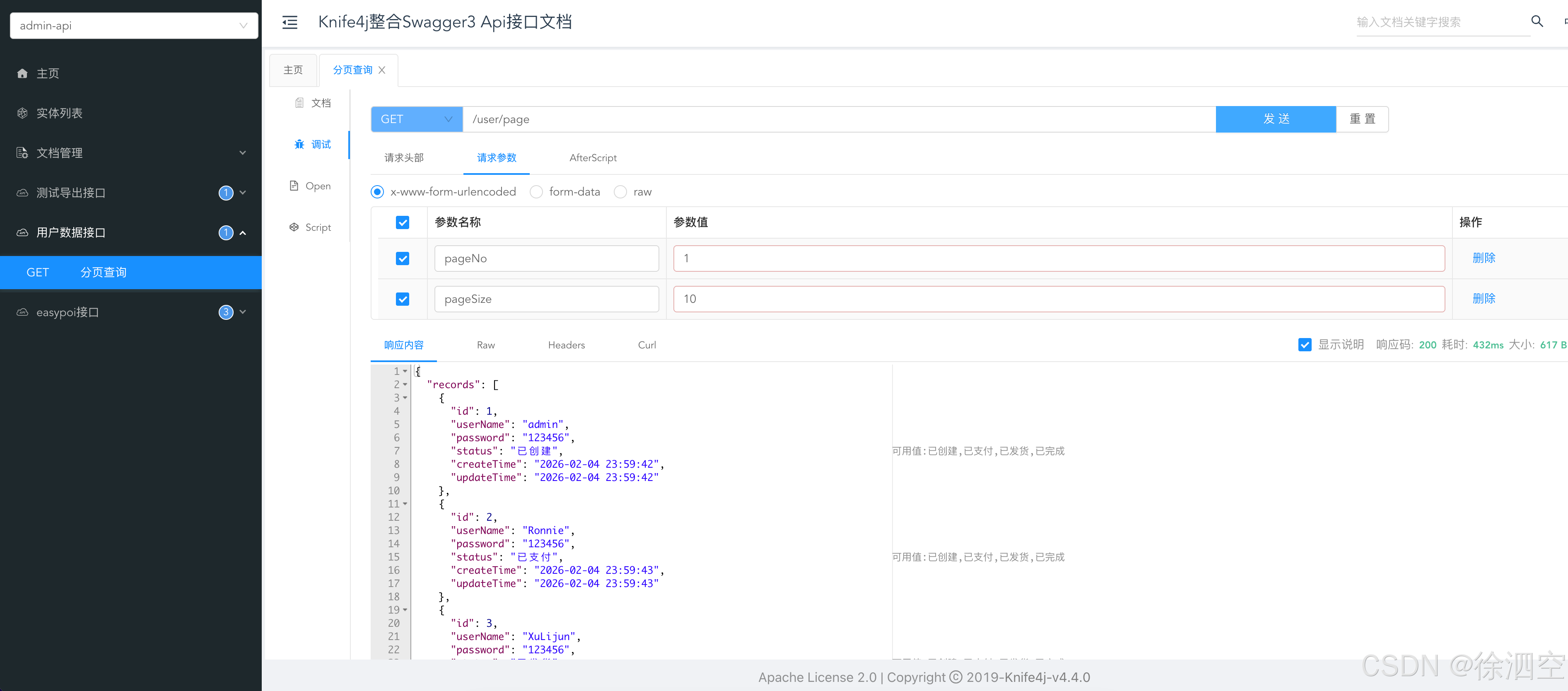 请求接口成功返回数据如下,所以我们的整个Springboot3整合Knife4j4成功,我们下回再见。