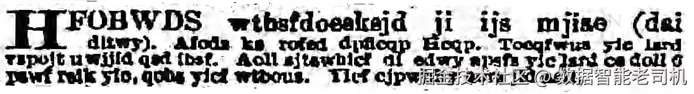 为了照顾急性子的读者,我们先给出第一个破译示例:下面这段密文来自一则加密广告,刊登于伦敦报纸 The Times,时间是 1873 年 8 月 1 日。这则广告以及我们稍后还会提到的其他一些加密报纸广告,出自 Jean Palmer 于 2005 年出版的《The Agony Column Codes & Ciphers》。(Jean Palmer 是伦敦破译专家 Tony Gaffney 使用的笔名。)3