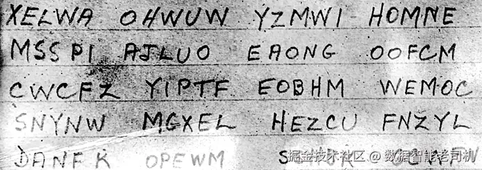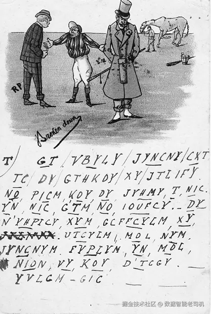 几十年、甚至几百年前的加密信息一点也不罕见。已知存在无数加密的日记、信件、笔记本、无线电报文、报纸广告和电报------更不用说大量加密明信片了,比如图 1-1 这张。加密文件也能在档案馆、私人收藏和跳蚤市场里找到,也能在互联网拍卖平台、网站和邮件列表上发现。还有更多加密信息被印在书籍、报纸和杂志里,新旧皆有。