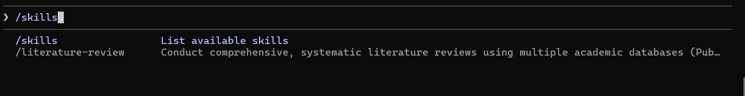 下图为导入的科研技能列表(我导入了一个综述技能),当使用时,直接输入命令/literature-review 帮我撰写一篇基于深度学习的图像识别综述 即可。